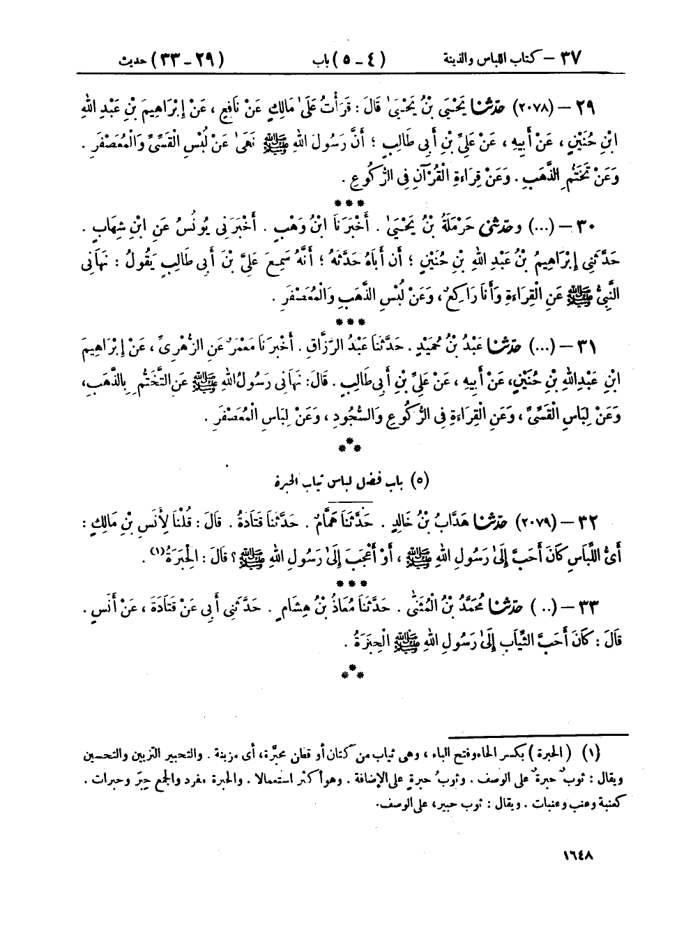 ٣٣ - (٢٠٧٩) حَدَّثَنَا مُحَمَّدُ بْنُ الْمُثَنَّى، حَدَّثَنَا مُعَاذُ بْنُ هِشَامٍ، حَدَّثَنِي أَبِي، عَنْ قَتَادَةَ، عَنْ أَنَسٍ، قَالَ: «كَانَ أَحَبَّ الثِّيَابِ إِلَى رَسُولِ اللهِ صَلَّى اللهُ عَلَيْهِ وَسَلَّمَ الْحِبَرَةُ»