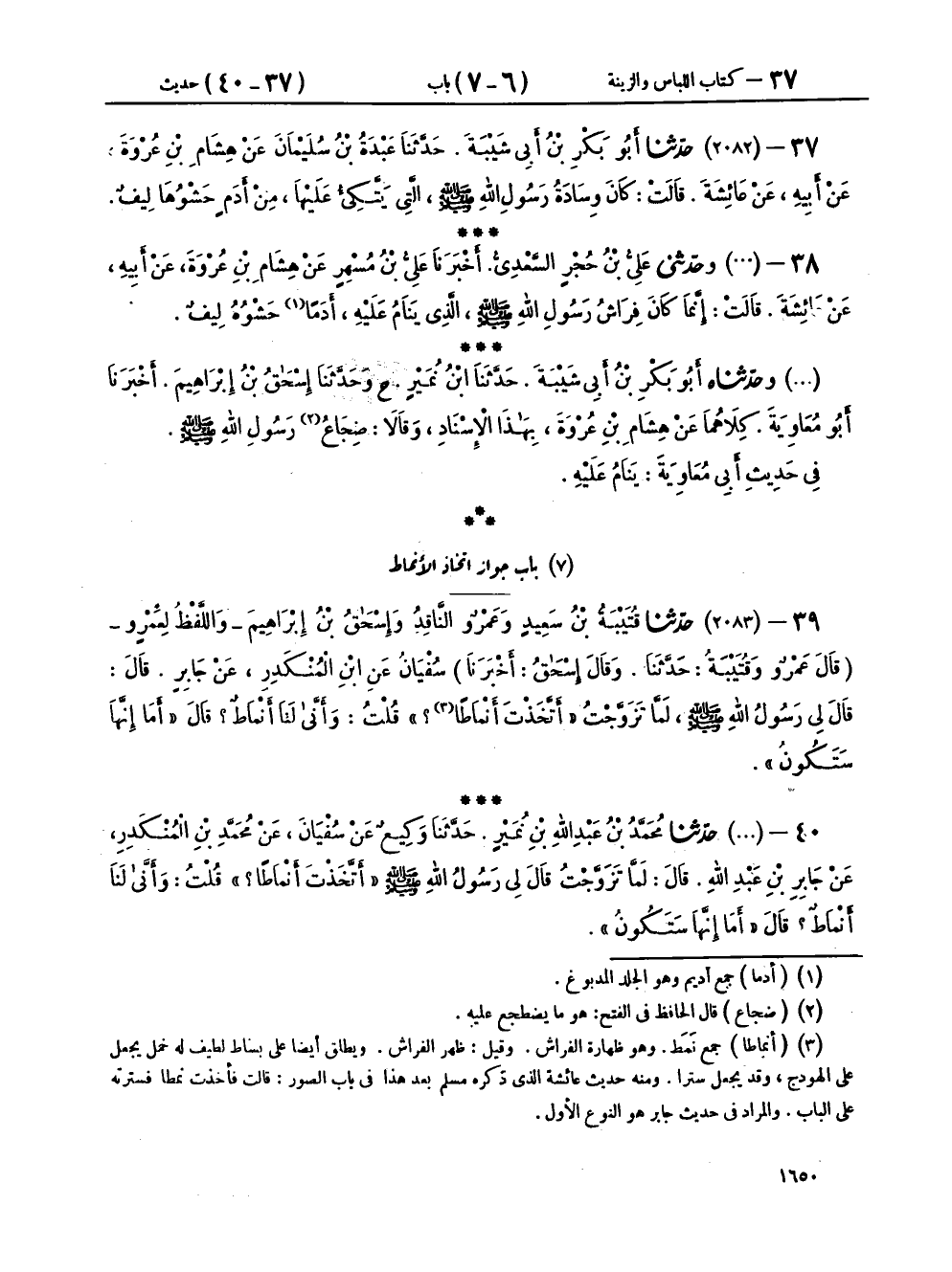 ٣٨ - (٢٠٨٢) وحَدَّثَنِي عَلِيُّ بْنُ حُجْرٍ السَّعْدِيُّ، أَخْبَرَنَا عَلِيُّ بْنُ مُسْهِرٍ، عَنْ هِشَامِ بْنِ عُرْوَةَ، عَنْ أَبِيهِ، عَنْ عَائِشَةَ، قَالَتْ: «إِنَّمَا كَانَ فِرَاشُ رَسُولِ اللهِ صَلَّى اللهُ عَلَيْهِ وَسَلَّمَ الَّذِي يَنَامُ عَلَيْهِ أَدَمًا حَشْوُهُ لِيفٌ»،