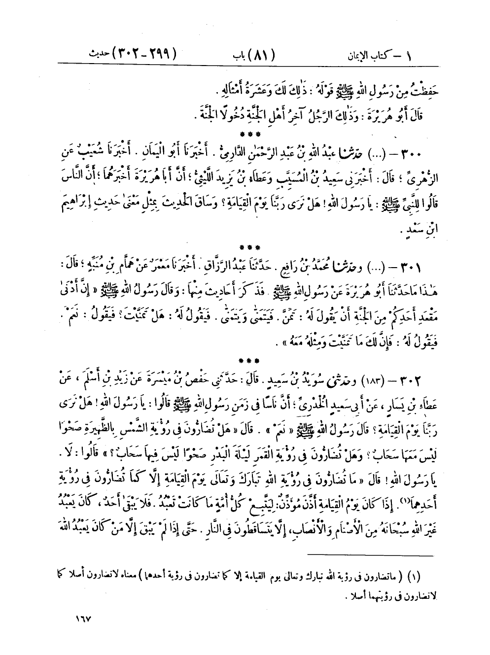 ٣٠٢ - (١٨٣) وَحَدَّثَنِي سُوَيْدُ بْنُ سَعِيدٍ، قَالَ: حَدَّثَنِي حَفْصُ بْنُ مَيْسَرَةَ، عَنْ زَيْدِ بْنِ أَسْلَمَ، عَنْ عَطَاءِ بْنِ يَسَارٍ، عَنْ أَبِي سَعِيدٍ الْخُدْرِيِّ، أَنَّ نَاسًا فِي زَمَنِ رَسُولِ اللهِ صَلَّى اللهُ عَلَيْهِ وَسَلَّمَ قَالُوا: يَا رَسُولَ اللهِ، هَلْ نَرَى رَبَّنَا يَوْمَ الْقِيَامَةِ؟ قَالَ رَسُولُ اللهِ صَلَّى اللهُ عَلَيْهِ وَسَلَّمَ: «نَعَمْ» قَالَ: «هَلْ تُضَارُّونَ فِي رُؤْيَةِ الشَّمْسِ بِالظَّهِيرَةِ صَحْوًا لَيْسَ مَعَهَا سَحَابٌ؟ وَهَلْ تُضَارُّونَ فِي رُؤْيَةِ الْقَمَرِ لَيْلَةَ الْبَدْرِ صَحْوًا لَيْسَ فِيهَا سَحَابٌ؟» قَالُوا: لَا يَا رَسُولَ اللهِ، قَالَ: " مَا تُضَارُّونَ فِي رُؤْيَةِ اللهِ تَبَارَكَ وَتَعَالَى يَوْمَ الْقِيَامَةِ إِلَّا كَمَا تُضَارُّونَ فِي رُؤْيَةِ أَحَدِهِمَا، إِذَا كَانَ يَوْمُ الْقِيَامَةِ أَذَّنَ مُؤَذِّنٌ لِيَتَّبِعْ كُلُّ أُمَّةٍ مَا كَانَتْ تَعْبُدُ، فَلَا يَبْقَى أَحَدٌ كَانَ يَعْبُدُ غَيْرَ اللهِ سُبْحَانَهُ مِنَ الْأَصْنَامِ وَالْأَنْصَابِ إِلَّا يَتَسَاقَطُونَ فِي النَّارِ، حَتَّى إِذَا لَمْ يَبْقَ إِلَّا مَنْ كَانَ يَعْبُدُ اللهَ ⦗١٦٨⦘ مِنْ بَرٍّ وَفَاجِرٍ وَغُبَّرِ أَهْلِ الْكِتَابِ، فَيُدْعَى الْيَهُودُ، فَيُقَالُ لَهُمْ: مَا كُنْتُمْ تَعْبُدُونَ؟ قَالُوا: كُنَّا نَعْبُدُ عُزَيْرَ ابْنَ اللهِ، فَيُقَالُ: كَذَبْتُمْ مَا اتَّخَذَ اللهُ مِنْ صَاحِبَةٍ وَلَا وَلَدٍ، فَمَاذَا تَبْغُونَ؟ قَالُوا: عَطِشْنَا يَا رَبَّنَا، فَاسْقِنَا، فَيُشَارُ إِلَيْهِمْ أَلَا تَرِدُونَ؟ فَيُحْشَرُونَ إِلَى النَّارِ كَأَنَّهَا سَرَابٌ يَحْطِمُ بَعْضُهَا بَعْضًا، فَيَتَسَاقَطُونَ فِي النَّارِ، ثُمَّ يُدْعَى النَّصَارَى، فَيُقَالُ لَهُمْ: مَا كُنْتُمْ تَعْبُدُونَ؟ قَالُوا: كُنَّا نَعْبُدُ الْمَسِيحَ ابْنَ اللهِ، فَيُقَالُ لَهُمْ، كَذَبْتُمْ مَا اتَّخَذَ اللهُ مِنْ صَاحِبَةٍ وَلَا وَلَدٍ، فَيُقَالُ لَهُمْ: مَاذَا تَبْغُونَ؟ فَيَقُولُونَ: عَطِشْنَا يَا رَبَّنَا، فَاسْقِنَا، قَالَ: فَيُشَارُ إِلَيْهِمْ أَلَا تَرِدُونَ؟ فَيُحْشَرُونَ إِلَى جَهَنَّمَ كَأَنَّهَا سَرَابٌ يَحْطِمُ بَعْضُهَا بَعْضًا، فَيَتَسَاقَطُونَ فِي النَّارِ حَتَّى إِذَا لَمْ يَبْقَ إِلَّا مَنْ كَانَ يَعْبُدُ اللهَ تَعَالَى مِنْ بَرٍّ وَفَاجِرٍ أَتَاهُمْ رَبُّ الْعَالَمِينَ سُبْحَانَهُ وَتَعَالَى فِي أَدْنَى صُورَةٍ مِنَ الَّتِي رَأَوْهُ فِيهَا قَالَ: فَمَا تَنْتَظِرُونَ؟ تَتْبَعُ كُلُّ أُمَّةٍ مَا كَانَتْ تَعْبُدُ، قَالُوا: يَا رَبَّنَا، فَارَقْنَا النَّاسَ فِي الدُّنْيَا أَفْقَرَ مَا كُنَّا إِلَيْهِمْ، وَلَمْ نُصَاحِبْهُمْ، فَيَقُولُ: أَنَا رَبُّكُمْ، فَيَقُولُونَ: نَعُوذُ بِاللهِ مِنْكَ لَا نُشْرِكُ بِاللهِ شَيْئًا مَرَّتَيْنِ أَوْ ثَلَاثًا، حَتَّى إِنَّ بَعْضَهُمْ لَيَكَادُ أَنْ يَنْقَلِبَ، فَيَقُولُ: هَلْ بَيْنَكُمْ وَبَيْنَهُ آيَةٌ فَتَعْرِفُونَهُ بِهَا؟ فَيَقُولُونَ: نَعَمْ، فَيُكْشَفُ عَنْ سَاقٍ فَلَا يَبْقَى مَنْ كَانَ يَسْجُدُ لِلَّهِ مِنْ تِلْقَاءِ نَفْسِهِ إِلَّا أَذِنَ اللهُ لَهُ بِالسُّجُودِ، وَلَا يَبْقَى مَنْ كَانَ يَسْجُدُ اتِّقَاءً وَرِيَاءً إِلَّا جَعَلَ اللهُ ⦗١٦٩⦘ ظَهْرَهُ طَبَقَةً وَاحِدَةً، كُلَّمَا أَرَادَ أَنْ يَسْجُدَ خَرَّ عَلَى قَفَاهُ، ثُمَّ يَرْفَعُونَ رُءُوسَهُمْ وَقَدْ تَحَوَّلَ فِي صُورَتِهِ الَّتِي رَأَوْهُ فِيهَا أَوَّلَ مَرَّةٍ، فَقَالَ: أَنَا رَبُّكُمْ، فَيَقُولُونَ: أَنْتَ رَبُّنَا، ثُمَّ يُضْرَبُ الْجِسْرُ عَلَى جَهَنَّمَ، وَتَحِلُّ الشَّفَاعَةُ، وَيَقُولُونَ: اللهُمَّ سَلِّمْ، سَلِّمْ " قِيلَ: يَا رَسُولَ اللهِ، وَمَا الْجِسْرُ؟ قَالَ: " دَحْضٌ مَزِلَّةٌ، فِيهِ خَطَاطِيفُ وَكَلَالِيبُ وَحَسَكٌ تَكُ