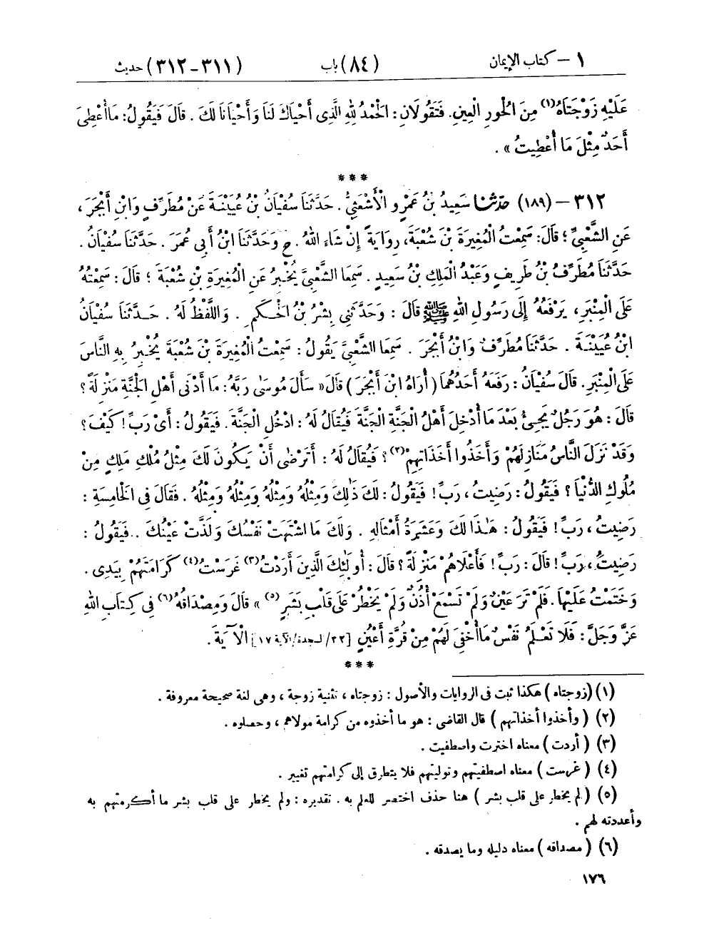 ٣١٢ - (١٨٩) حَدَّثَنَا سَعِيدُ بْنُ عَمْرٍو الْأَشْعَثِيُّ، حَدَّثَنَا سُفْيَانُ بْنُ عُيَيْنَةَ، عَنْ مُطَرِّفٍ، وَابْنِ أَبْجَرَ، عَنِ الشَّعْبِيِّ قَالَ: سَمِعْتُ الْمُغِيرَةَ بْنَ شُعْبَةَ رِوَايَةً - إِنْ شَاءَ اللهُ - ح، وَحَدَّثَنَا ابْنُ أَبِي عُمَرَ، حَدَّثَنَا سُفْيَانُ، حَدَّثَنَا مُطَرِّفُ بْنُ طَرِيفٍ، وَعَبْدُ الْمَلِكِ بْنُ سَعِيدٍ، سَمِعَا الشَّعْبِيَّ، يُخْبِرُ عَنِ الْمُغِيرَةِ بْنِ شُعْبَةَ، قَالَ: سَمِعْتُهُ عَلَى الْمِنْبَرِ يَرْفَعُهُ إِلَى رَسُولِ اللهِ صَلَّى اللهُ عَلَيْهِ وَسَلَّمَ قَالَ: وَحَدَّثَنِي بِشْرُ بْنُ الْحَكَمِ - وَاللَّفْظُ لَهُ - حَدَّثَنَا سُفْيَانُ بْنُ عُيَيْنَةَ، حَدَّثَنَا مُطَرِّفٌ، وَابْنُ أَبْجَرَ سَمِعَا الشَّعْبِيَّ، يَقُولُ: سَمِعْتُ الْمُغِيرَةَ بْنَ شُعْبَةَ، يُخْبِرُ بِهِ النَّاسَ عَلَى الْمِنْبَرِ - قَالَ سُفْيَانُ: رَفَعَهُ أَحَدُهُمَا، أُرَاهُ ابْنَ أَبْجَرَ - قَالَ: " سَأَلَ مُوسَى رَبَّهُ، مَا أَدْنَى أَهْلِ الْجَنَّةِ مَنْزِلَةً، قَالَ: هُوَ رَجُلٌ يَجِيءُ بَعْدَ مَا أُدْخِلَ أَهْلُ الْجَنَّةِ الْجَنَّةَ، فَيُقَالُ لَهُ: ادْخُلِ الْجَنَّةَ، فَيَقُولُ: أَيْ رَبِّ، كَيْفَ وَقَدْ نَزَلَ النَّاسُ مَنَازِلَهُمْ، وَأَخَذُوا أَخَذَاتِهِمْ، فَيُقَالُ لَهُ: أَتَرْضَى أَنْ يَكُونَ لَكَ مِثْلُ مُلْكِ مَلِكٍ مِنْ مُلُوكِ الدُّنْيَا؟ فَيَقُولُ: رَضِيتُ رَبِّ، فَيَقُولُ: لَكَ ذَلِكَ، وَمِثْلُهُ وَمِثْلُهُ وَمِثْلُهُ وَمِثْلُهُ، فَقَالَ فِي الْخَامِسَةِ: رَضِيتُ رَبِّ، فَيَقُولُ: هَذَا لَكَ وَعَشَرَةُ أَمْثَالِهِ، وَلَكَ مَا اشْتَهَتْ نَفْسُكَ، وَلَذَّتْ عَيْنُكَ، فَيَقُولُ: رَضِيتُ رَبِّ، قَالَ: رَبِّ، فَأَعْلَاهُمْ مَنْزِلَةً؟ قَالَ: أُولَئِكَ الَّذِينَ أَرَدْتُ غَرَسْتُ كَرَامَتَهُمْ بِيَدِي، وَخَتَمْتُ عَلَيْهَا، فَلَمْ تَرَ عَيْنٌ، وَلَمْ تَسْمَعْ أُذُنٌ، وَلَمْ يَخْطُرْ عَلَى قَلْبِ بَشَرٍ "، قَالَ: وَمِصْدَاقُهُ فِي كِتَابِ اللهِ عَزَّ وَجَلَّ: " {فَلَا تَعْلَمُ نَفْسٌ مَا أُخْفِيَ لَهُمْ مِنْ قُرَّةِ أَعْيُنٍ} [السجدة: ١٧] الْآيَةَ.