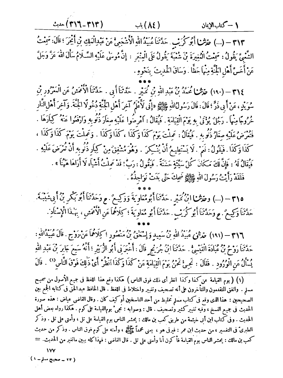 ٣١٤ - (١٩٠) حَدَّثَنَا مُحَمَّدُ بْنُ عَبْدِ اللهِ بْنِ نُمَيْرٍ، حَدَّثَنَا أَبِي، حَدَّثَنَا الْأَعْمَشُ، عَنِ الْمَعْرُورِ بْنِ سُوَيْدٍ، عَنْ أَبِي ذَرٍّ، قَالَ: قَالَ رَسُولُ اللهِ صَلَّى اللهُ عَلَيْهِ وَسَلَّمَ: " إِنِّي لَأَعْلَمُ آخِرَ أَهْلِ الْجَنَّةِ دُخُولًا الْجَنَّةَ، وَآخِرَ أَهْلِ النَّارِ خُرُوجًا مِنْهَا، رَجُلٌ يُؤْتَى بِهِ يَوْمَ الْقِيَامَةِ، فَيُقَالُ: اعْرِضُوا عَلَيْهِ صِغَارَ ذُنُوبِهِ، وَارْفَعُوا عَنْهُ كِبَارَهَا، فَتُعْرَضُ عَلَيْهِ صِغَارُ ذُنُوبِهِ، فَيُقَالُ: عَمِلْتَ يَوْمَ كَذَا وَكَذَا كَذَا وَكَذَا، وَعَمِلْتَ يَوْمَ كَذَا وَكَذَا كَذَا وَكَذَا، فَيَقُولُ: نَعَمْ، لَا يَسْتَطِيعُ أَنْ يُنْكِرَ وَهُوَ مُشْفِقٌ مِنْ كِبَارِ ذُنُوبِهِ أَنْ تُعْرَضَ عَلَيْهِ، فَيُقَالُ لَهُ: فَإِنَّ لَكَ مَكَانَ كُلِّ سَيِّئَةٍ حَسَنَةً، فَيَقُولُ: رَبِّ، قَدْ عَمِلْتُ أَشْيَاءَ لَا أَرَاهَا هَا هُنَا " فَلَقَدْ رَأَيْتُ رَسُولَ اللهِ صَلَّى اللهُ عَلَيْهِ وَسَلَّمَ ضَحِكَ حَتَّى بَدَتْ نَوَاجِذُهُ،