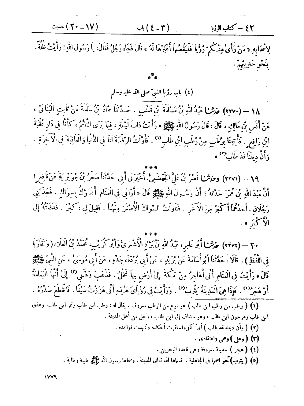 ١٨ - (٢٢٧٠) حَدَّثَنَا عَبْدُ اللهِ بْنُ مَسْلَمَةَ بْنِ قَعْنَبٍ، حَدَّثَنَا حَمَّادُ بْنُ سَلَمَةَ، عَنْ ثَابِتٍ الْبُنَانِيِّ، عَنْ أَنَسِ بْنِ مَالِكٍ، قَالَ: قَالَ رَسُولُ اللهِ صَلَّى اللهُ عَلَيْهِ وَسَلَّمَ: «رَأَيْتُ ذَاتَ لَيْلَةٍ، فِيمَا يَرَى النَّائِمُ، كَأَنَّا فِي دَارِ عُقْبَةَ بْنِ رَافِعٍ، فَأُتِينَا بِرُطَبٍ مِنْ رُطَبِ ابْنِ طَابٍ، فَأَوَّلْتُ الرِّفْعَةَ لَنَا فِي الدُّنْيَا، وَالْعَاقِبَةَ فِي الْآخِرَةِ، وَأَنَّ دِينَنَا قَدْ طَابَ»