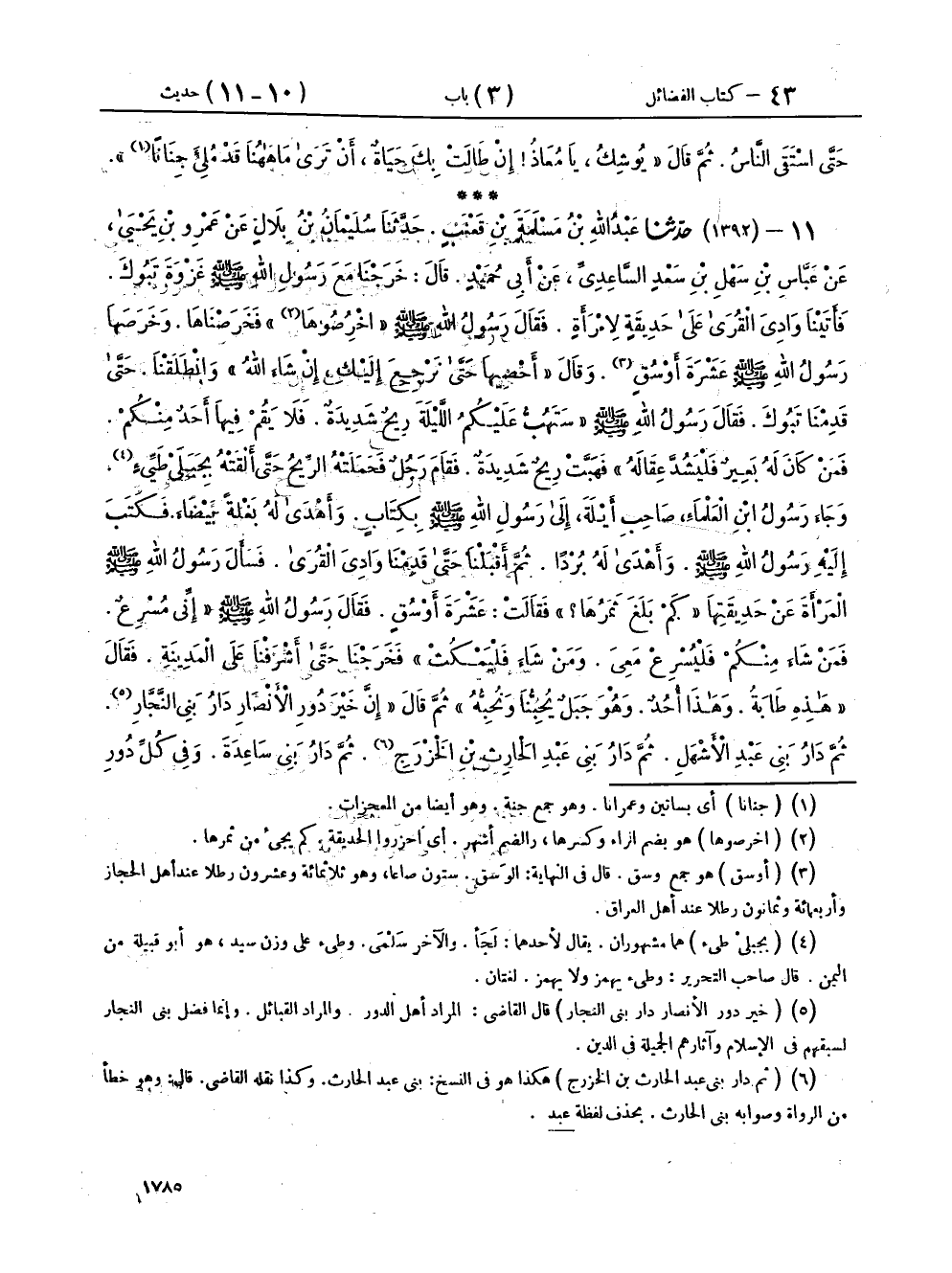 ١١ - (١٣٩٢) حَدَّثَنَا عَبْدُ اللهِ بْنُ مَسْلَمَةَ بْنِ قَعْنَبٍ، حَدَّثَنَا سُلَيْمَانُ بْنُ بِلَالٍ، عَنْ عَمْرِو بْنِ يَحْيَى، عَنْ عَبَّاسِ بْنِ سَهْلِ بْنِ سَعْدٍ السَّاعِدِيِّ، عَنْ أَبِي حُمَيْدٍ، قَالَ: خَرَجْنَا مَعَ رَسُولِ اللهِ صَلَّى اللهُ عَلَيْهِ وَسَلَّمَ غَزْوَةَ تَبُوكَ فَأَتَيْنَا وَادِيَ الْقُرَى عَلَى حَدِيقَةٍ لِامْرَأَةٍ فَقَالَ رَسُولُ اللهِ صَلَّى اللهُ عَلَيْهِ وَسَلَّمَ: «اخْرُصُوهَا» فَخَرَصْنَاهَا وَخَرَصَهَا رَسُولُ اللهِ صَلَّى اللهُ عَلَيْهِ وَسَلَّمَ عَشَرَةَ أَوْسُقٍ، وَقَالَ: «أَحْصِيهَا حَتَّى نَرْجِعَ إِلَيْكِ، إِنْ شَاءَ اللهُ» وَانْطَلَقْنَا، حَتَّى قَدِمْنَا تَبُوكَ فَقَالَ رَسُولُ اللهِ صَلَّى اللهُ عَلَيْهِ وَسَلَّمَ: «سَتَهُبُّ عَلَيْكُمُ اللَّيْلَةَ رِيحٌ شَدِيدَةٌ، فَلَا يَقُمْ فِيهَا أَحَدٌ مِنْكُمْ فَمَنْ كَانَ لَهُ بَعِيرٌ فَلْيَشُدَّ عِقَالَهُ» فَهَبَّتْ رِيحٌ شَدِيدَةٌ، فَقَامَ رَجُلٌ فَحَمَلَتْهُ الرِّيحُ حَتَّى أَلْقَتْهُ بِجَبَلَيْ طَيِّئٍ، وَجَاءَ رَسُولُ ابْنِ الْعَلْمَاءِ، صَاحِبِ أَيْلَةَ، إِلَى رَسُولِ اللهِ صَلَّى اللهُ عَلَيْهِ وَسَلَّمَ بِكِتَابٍ، وَأَهْدَى لَهُ بَغْلَةً بَيْضَاءَ، فَكَتَبَ إِلَيْهِ رَسُولُ اللهِ صَلَّى اللهُ عَلَيْهِ وَسَلَّمَ، وَأَهْدَى لَهُ بُرْدًا، ثُمَّ أَقْبَلْنَا حَتَّى قَدِمْنَا وَادِيَ الْقُرَى، فَسَأَلَ رَسُولُ اللهِ صَلَّى اللهُ عَلَيْهِ وَسَلَّمَ الْمَرْأَةَ عَنْ حَدِيقَتِهَا «كَمْ بَلَغَ ثَمَرُهَا؟» فَقَالَتْ عَشَرَةَ أَوْسُقٍ