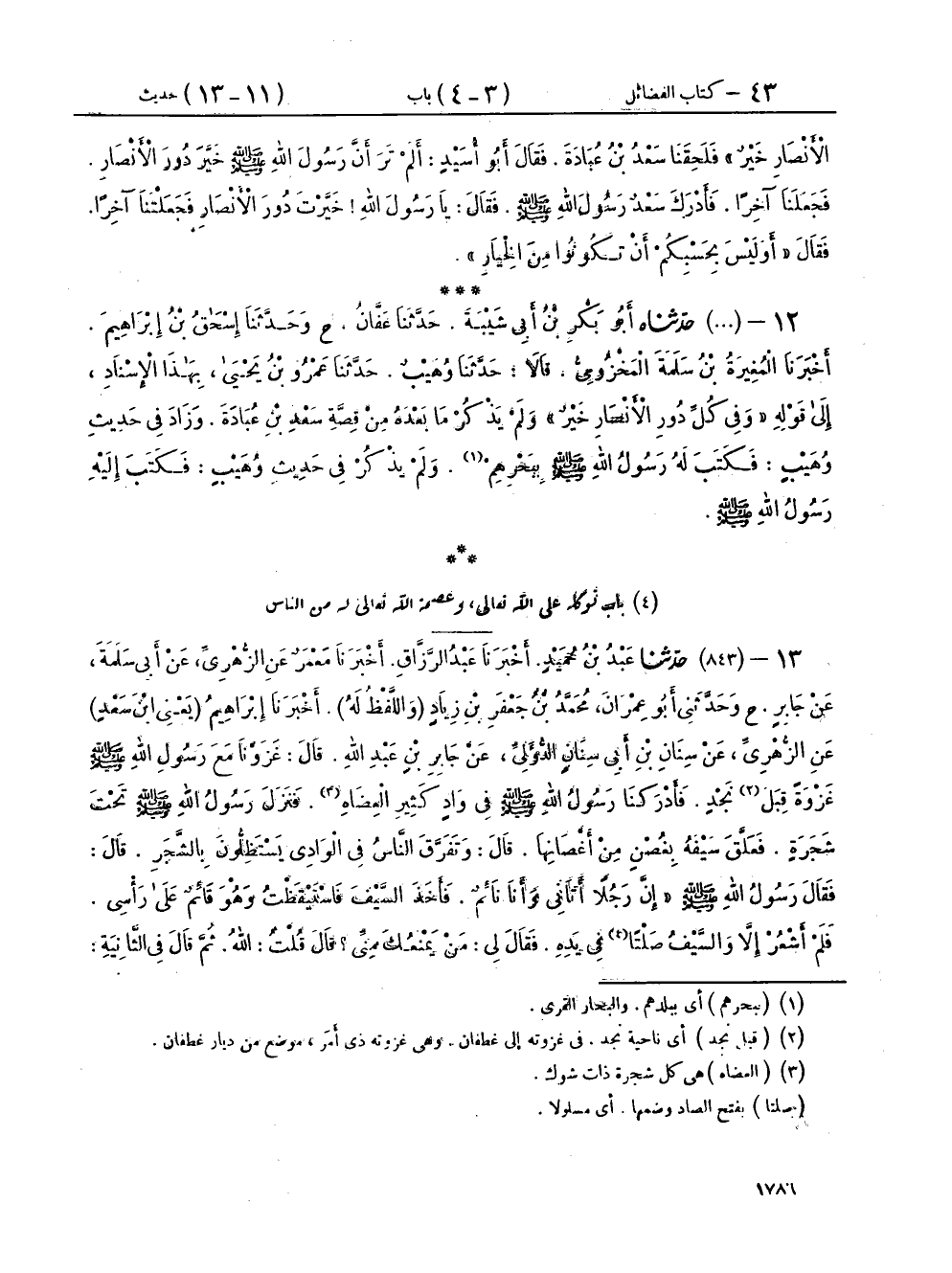 [ ش (قبل نجد) أي ناحية نجد في غزوته إلى غطفان وهي غزوته ذي أمر موضع من ديار غطفان (العضاه) هي كل شجرة ذات شوك (صلتا) بفتح الصاد وضمها أي مسلولا (فشام السف) معناه غمده ورده في غمده يقال شام السيف إذا سله وإذا أغمده فهو من الأضداد والمراد هنا غمده]