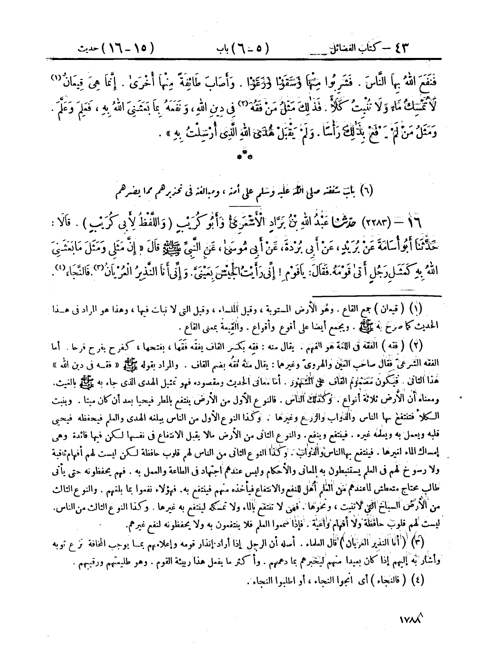 ١٦ - (٢٢٨٣) حَدَّثَنَا عَبْدُ اللهِ بْنُ بَرَّادٍ الْأَشْعَرِيُّ، وَأَبُو كُرَيْبٍ - وَاللَّفْظُ لِأَبِي كُرَيْبٍ - قَالَا: حَدَّثَنَا أَبُو أُسَامَةَ، عَنْ بُرَيْدٍ، عَنْ أَبِي بُرْدَةَ، عَنْ أَبِي مُوسَى، عَنِ النَّبِيِّ صَلَّى اللهُ عَلَيْهِ وَسَلَّمَ قَالَ: " إِنَّ مَثَلِي وَمَثَلَ مَا بَعَثَنِيَ اللهُ بِهِ كَمَثَلِ رَجُلٍ أَتَى قَوْمَهُ، فَقَالَ: يَا قَوْمِ إِنِّي رَأَيْتُ الْجَيْشَ بِعَيْنَيَّ، وَإِنِّي أَنَا النَّذِيرُ الْعُرْيَانُ، فَالنَّجَاءَ، فَأَطَاعَهُ طَائِفَةٌ مِنْ قَوْمِهِ، فَأَدْلَجُوا فَانْطَلَقُوا عَلَى مُهْلَتِهِمْ، وَكَذَّبَتْ طَائِفَةٌ مِنْهُمْ فَأَصْبَحُوا مَكَانَهُمْ، فَصَبَّحَهُمُ الْجَيْشُ فَأَهْلَكَهُمْ وَاجْتَاحَهُمْ، فَذَلِكَ مَثَلُ مَنْ أَطَاعَنِي وَاتَّبَعَ مَا جِئْتُ بِهِ، وَمَثَلُ مَنْ عَصَانِي وَكَذَّبَ مَا جِئْتُ بِهِ مِنَ الْحَقِّ "