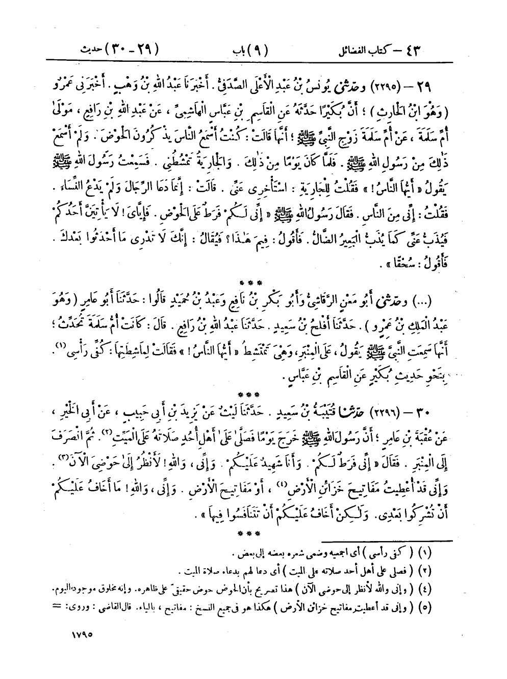 ٢٩ - (٢٢٩٥) وحَدَّثَنِي يُونُسُ بْنُ عَبْدِ الْأَعْلَى الصَّدَفِيُّ، أَخْبَرَنَا عَبْدُ اللهِ بْنُ وَهْبٍ، أَخْبَرَنِي عَمْرٌو وَهُوَ ابْنُ الْحَارِثِ أَنَّ بُكَيْرًا، حَدَّثَهُ عَنِ الْقَاسِمِ بْنِ عَبَّاسٍ الْهَاشِمِيِّ، عَنْ عَبْدِ اللهِ بْنِ رَافِعٍ، مَوْلَى أُمِّ سَلَمَةَ، عَنْ أُمِّ سَلَمَةَ، زَوْجِ النَّبِيِّ صَلَّى اللهُ عَلَيْهِ وَسَلَّمَ، أَنَّهَا قَالَتْ: كُنْتُ أَسْمَعُ النَّاسَ يَذْكُرُونَ الْحَوْضَ، وَلَمْ أَسْمَعْ ذَلِكَ مِنْ رَسُولِ اللهِ صَلَّى اللهُ عَلَيْهِ وَسَلَّمَ، فَلَمَّا كَانَ يَوْمًا مِنْ ذَلِكَ، وَالْجَارِيَةُ تَمْشُطُنِي، فَسَمِعْتُ رَسُولَ اللهِ صَلَّى اللهُ عَلَيْهِ وَسَلَّمَ يَقُولُ: «أَيُّهَا النَّاسُ» فَقُلْتُ لِلْجَارِيَةِ: اسْتَأْخِرِي عَنِّي، قَالَتْ: إِنَّمَا دَعَا الرِّجَالَ وَلَمْ يَدْعُ النِّسَاءَ، فَقُلْتُ: إِنِّي مِنَ النَّاسِ، فَقَالَ رَسُولُ اللهِ صَلَّى اللهُ عَلَيْهِ وَسَلَّمَ: " إِنِّي لَكُمْ فَرَطٌ عَلَى الْحَوْضِ، فَإِيَّايَ لَا يَأْتِيَنَّ أَحَدُكُمْ فَيُذَبُّ عَنِّي كَمَا يُذَبُّ الْبَعِيرُ الضَّالُّ، فَأَقُولُ: فِيمَ هَذَا؟ فَيُقَالُ: إِنَّكَ لَا تَدْرِي مَا أَحْدَثُوا بَعْدَكَ، فَأَقُولُ: سُحْقًا "
