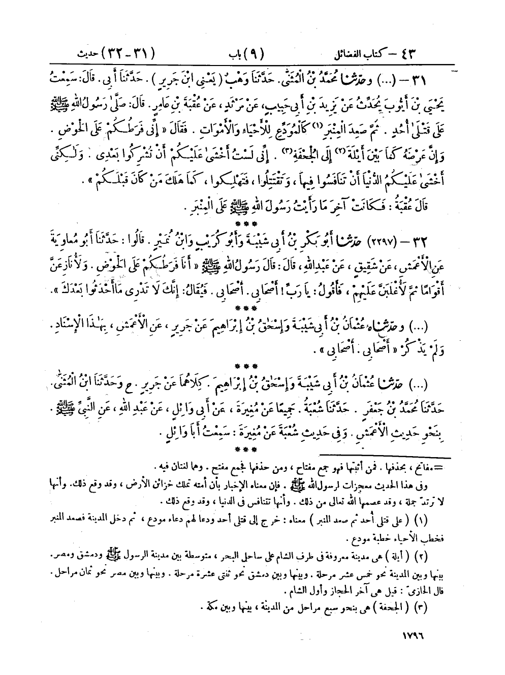 ٣١ - (٢٢٩٦) وَحَدَّثَنَا مُحَمَّدُ بْنُ الْمُثَنَّى، حَدَّثَنَا وَهْبٌ يَعْنِي ابْنَ جَرِيرٍ، حَدَّثَنَا أَبِي، قَالَ:، سَمِعْتُ يَحْيَى بْنَ أَيُّوبَ، يُحَدِّثُ عَنْ يَزِيدَ بْنِ أَبِي حَبِيبٍ، عَنْ مَرْثَدٍ، عَنْ عُقْبَةَ بْنِ عَامِرٍ، قَالَ صَلَّى رَسُولُ اللهِ صَلَّى اللهُ عَلَيْهِ وَسَلَّمَ: عَلَى قَتْلَى أُحُدٍ، ثُمَّ صَعِدَ الْمِنْبَرَ كَالْمُوَدِّعِ لِلْأَحْيَاءِ وَالْأَمْوَاتِ، فَقَالَ: «إِنِّي فَرَطُكُمْ عَلَى الْحَوْضِ، وَإِنَّ عَرْضَهُ كَمَا بَيْنَ أَيْلَةَ إِلَى الْجُحْفَةِ، إِنِّي لَسْتُ أَخْشَى عَلَيْكُمْ أَنْ تُشْرِكُوا بَعْدِي، وَلَكِنِّي أَخْشَى عَلَيْكُمُ الدُّنْيَا أَنْ تَنَافَسُوا فِيهَا، وَتَقْتَتِلُوا، فَتَهْلِكُوا، كَمَا هَلَكَ مَنْ كَانَ قَبْلَكُمْ» قَالَ عُقْبَةُ: «فَكَانَتْ آخِرَ مَا رَأَيْتُ رَسُولَ اللهِ صَلَّى اللهُ عَلَيْهِ وَسَلَّمَ عَلَى الْمِنْبَرِ»