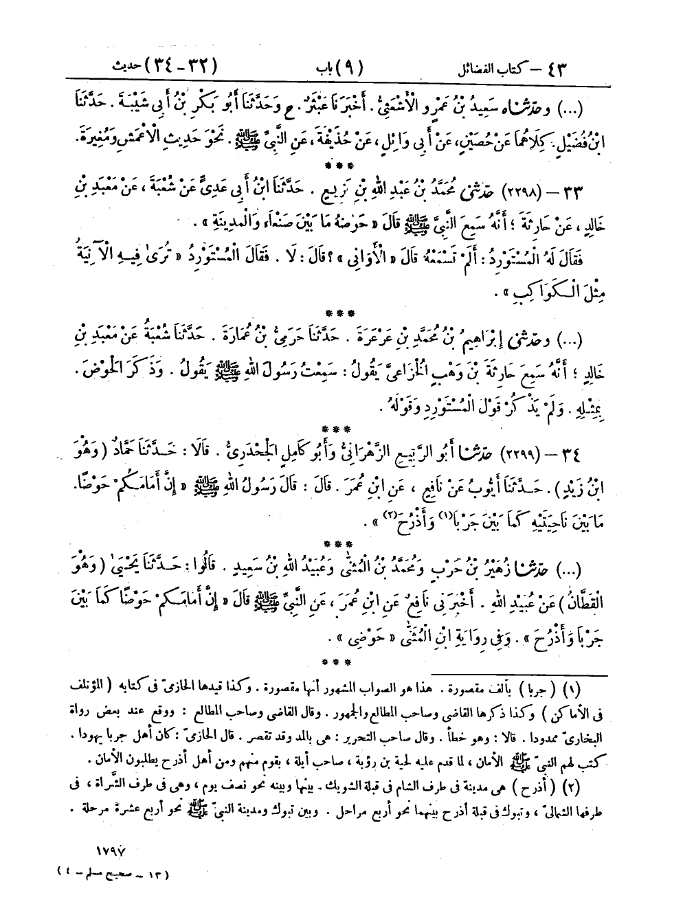 ٣٤ - (٢٢٩٩) حَدَّثَنَا أَبُو الرَّبِيعِ الزَّهْرَانِيُّ، وَأَبُو كَامِلٍ الْجَحْدَرِيُّ، قَالَا: حَدَّثَنَا حَمَّادٌ وَهُوَ ابْنُ زَيْدٍ، حَدَّثَنَا أَيُّوبُ، عَنْ نَافِعٍ، عَنِ ابْنِ عُمَرَ، قَالَ: قَالَ رَسُولُ اللهِ صَلَّى اللهُ عَلَيْهِ وَسَلَّمَ: «إِنَّ أَمَامَكُمْ حَوْضًا، مَا بَيْنَ نَاحِيَتَيْهِ كَمَا بَيْنَ جَرْبَاءَ وَأَذْرُحَ»