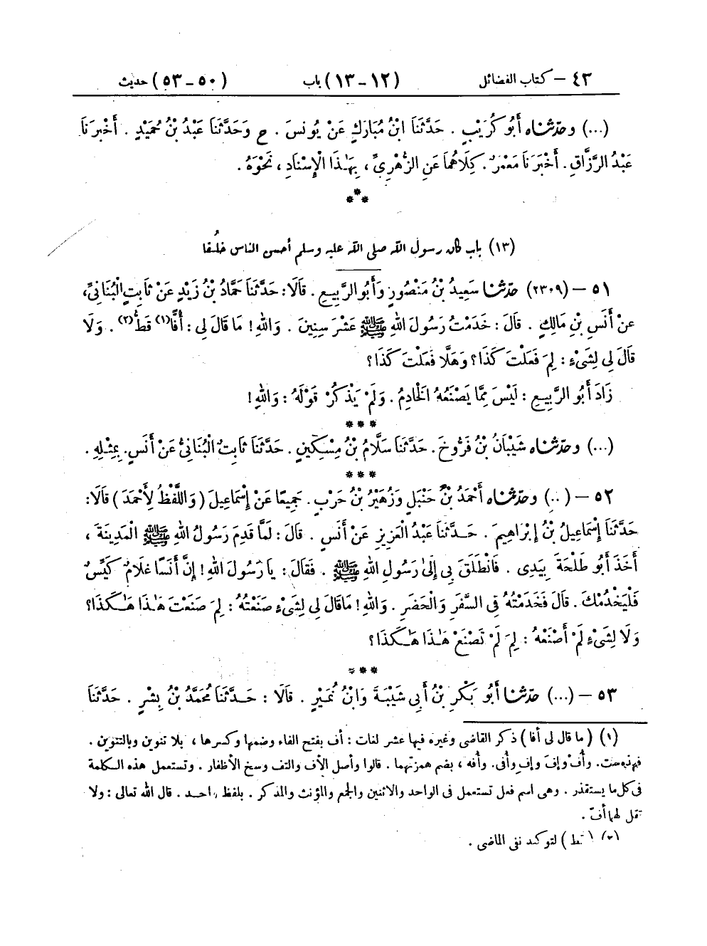 ٥١ - (٢٣٠٩) حَدَّثَنَا سَعِيدُ بْنُ مَنْصُورٍ، وَأَبُو الرَّبِيعِ، قَالَا: حَدَّثَنَا حَمَّادُ بْنُ زَيْدٍ، عَنْ ثَابِتٍ الْبُنَانِيِّ، عَنْ أَنَسِ بْنِ مَالِكٍ، قَالَ: " خَدَمْتُ رَسُولَ اللهِ صَلَّى اللهُ عَلَيْهِ وَسَلَّمَ عَشْرَ سِنِينَ، وَاللهِ مَا قَالَ لِي: أُفًّا قَطُّ، وَلَا قَالَ لِي لِشَيْءٍ: لِمَ فَعَلْتَ كَذَا؟ وَهَلَّا فَعَلْتَ كَذَا؟ " زَادَ أَبُو الرَّبِيعِ: لَيْسَ مِمَّا يَصْنَعُهُ الْخَادِمُ، وَلَمْ يَذْكُرْ قَوْلَهُ: وَاللهِ