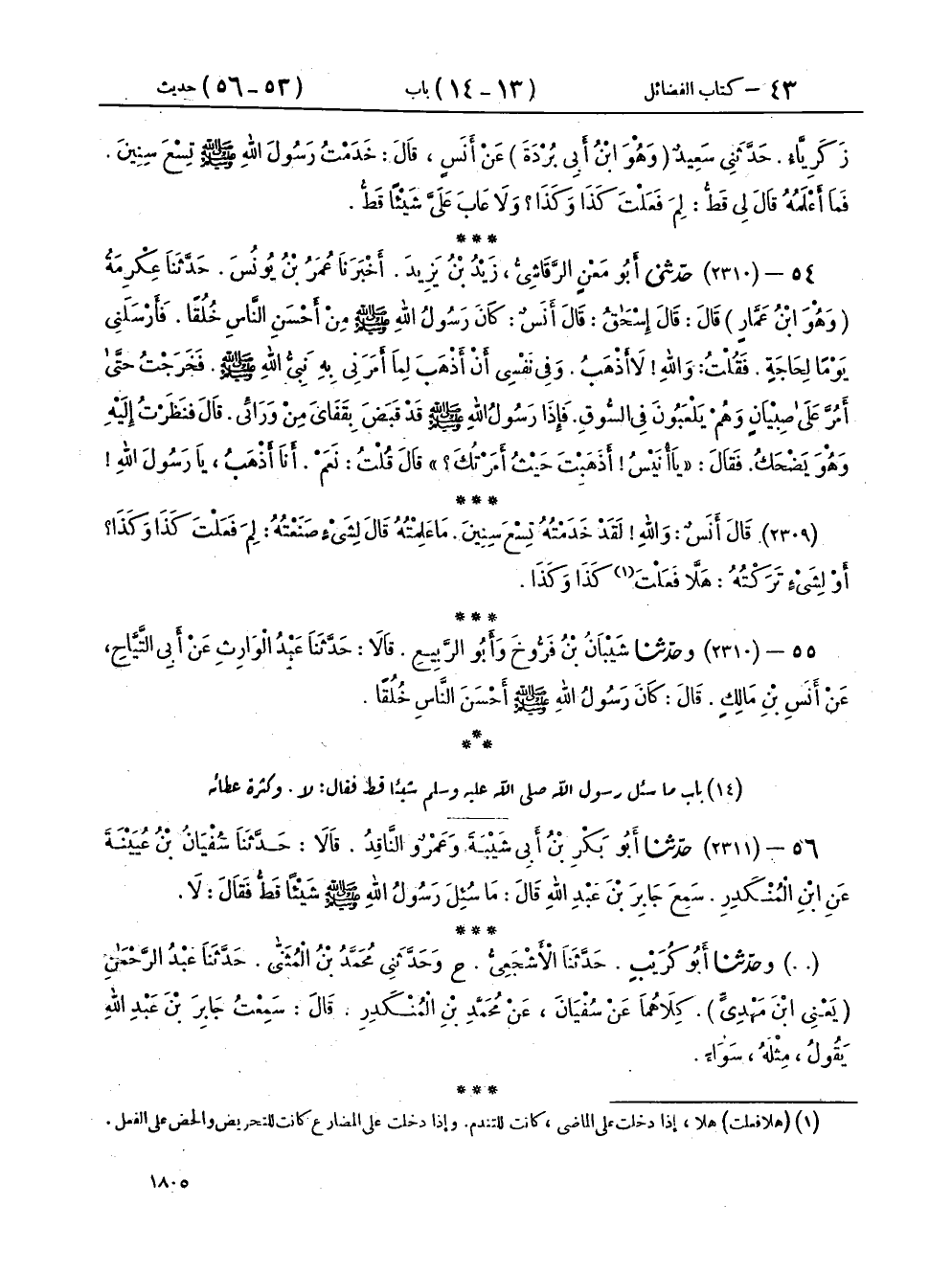 ٥٤ - (٢٣٠٩) قَالَ أَنَسٌ: " وَاللهِ لَقَدْ خَدَمْتُهُ تِسْعَ سِنِينَ، مَا عَلِمْتُهُ قَالَ لِشَيْءٍ صَنَعْتُهُ: لِمَ فَعَلْتَ كَذَا وَكَذَا؟ أَوْ لِشَيْءٍ تَرَكْتُهُ: هَلَّا فَعَلْتَ كَذَا وَكَذَا "