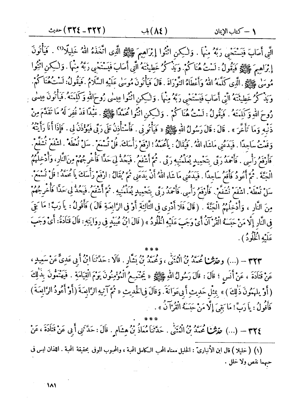 ٣٢٣ - (١٩٣) وَحَدَّثَنَا مُحَمَّدُ بْنُ الْمُثَنَّى، وَمُحَمَّدُ بْنُ بَشَّارٍ، قَالَا: حَدَّثَنَا ابْنُ أَبِي عَدِيٍّ، عَنْ سَعِيدٍ، عَنْ قَتَادَةَ، عَنْ أَنَسٍ، قَالَ: قَالَ رَسُولُ اللهِ صَلَّى اللهُ عَلَيْهِ وَسَلَّمَ: «يَجْتَمِعُ الْمُؤْمِنُونَ يَوْمَ الْقِيَامَةِ فَيَهْتَمُّونَ بِذَلِكَ» - أَوْ يُلْهَمُونَ ذَلِكَ - بِمِثْلِ حَدِيثِ أَبِي عَوَانَةَ، وَقَالَ فِي الْحَدِيثِ: " ثُمَّ آتِيهِ الرَّابِعَةَ - أَوْ أَعُودُ الرَّابِعَةَ - فَأَقُولُ: يَا رَبِّ، مَا بَقِيَ إِلَّا مَنْ حَبَسَهُ الْقُرْآنُ "،