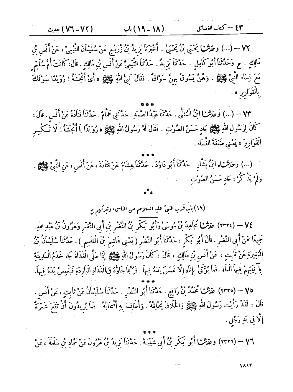 ٧٥ - (٢٣٢٥) حَدَّثَنَا مُحَمَّدُ بْنُ رَافِعٍ، حَدَّثَنَا أَبُو النَّضْرِ، حَدَّثَنَا سُلَيْمَانُ، عَنْ ثَابِتٍ، عَنْ أَنَسٍ، قَالَ: لَقَدْ «رَأَيْتُ رَسُولَ اللهِ صَلَّى اللهُ عَلَيْهِ وَسَلَّمَ وَالْحَلَّاقُ يَحْلِقُهُ، وَأَطَافَ بِهِ أَصْحَابُهُ، فَمَا يُرِيدُونَ أَنْ تَقَعَ شَعْرَةٌ إِلَّا فِي يَدِ رَجُلٍ»
