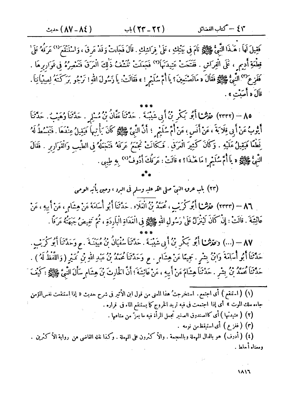 ٨٥ - (٢٣٣٢) حَدَّثَنَا أَبُو بَكْرِ بْنُ أَبِي شَيْبَةَ، حَدَّثَنَا عَفَّانُ بْنُ مُسْلِمٍ، حَدَّثَنَا وُهَيْبٌ، حَدَّثَنَا أَيُّوبُ، عَنْ أَبِي قِلَابَةَ، عَنْ أَنَسٍ، عَنْ أُمِّ سُلَيْمٍ، أَنَّ النَّبِيَّ صَلَّى اللهُ عَلَيْهِ وَسَلَّمَ كَانَ يَأْتِيهَا فَيَقِيلُ عِنْدَهَا فَتَبْسُطُ لَهُ نِطْعًا فَيَقِيلُ عَلَيْهِ، وَكَانَ كَثِيرَ الْعَرَقِ، فَكَانَتْ تَجْمَعُ عَرَقَهُ فَتَجْعَلُهُ فِي الطِّيبِ وَالْقَوَارِيرِ، فَقَالَ النَّبِيُّ صَلَّى اللهُ عَلَيْهِ وَسَلَّمَ: «يَا أُمَّ سُلَيْمٍ مَا هَذَا؟» قَالَتْ: عَرَقُكَ أَدُوفُ بِهِ طِيبِي