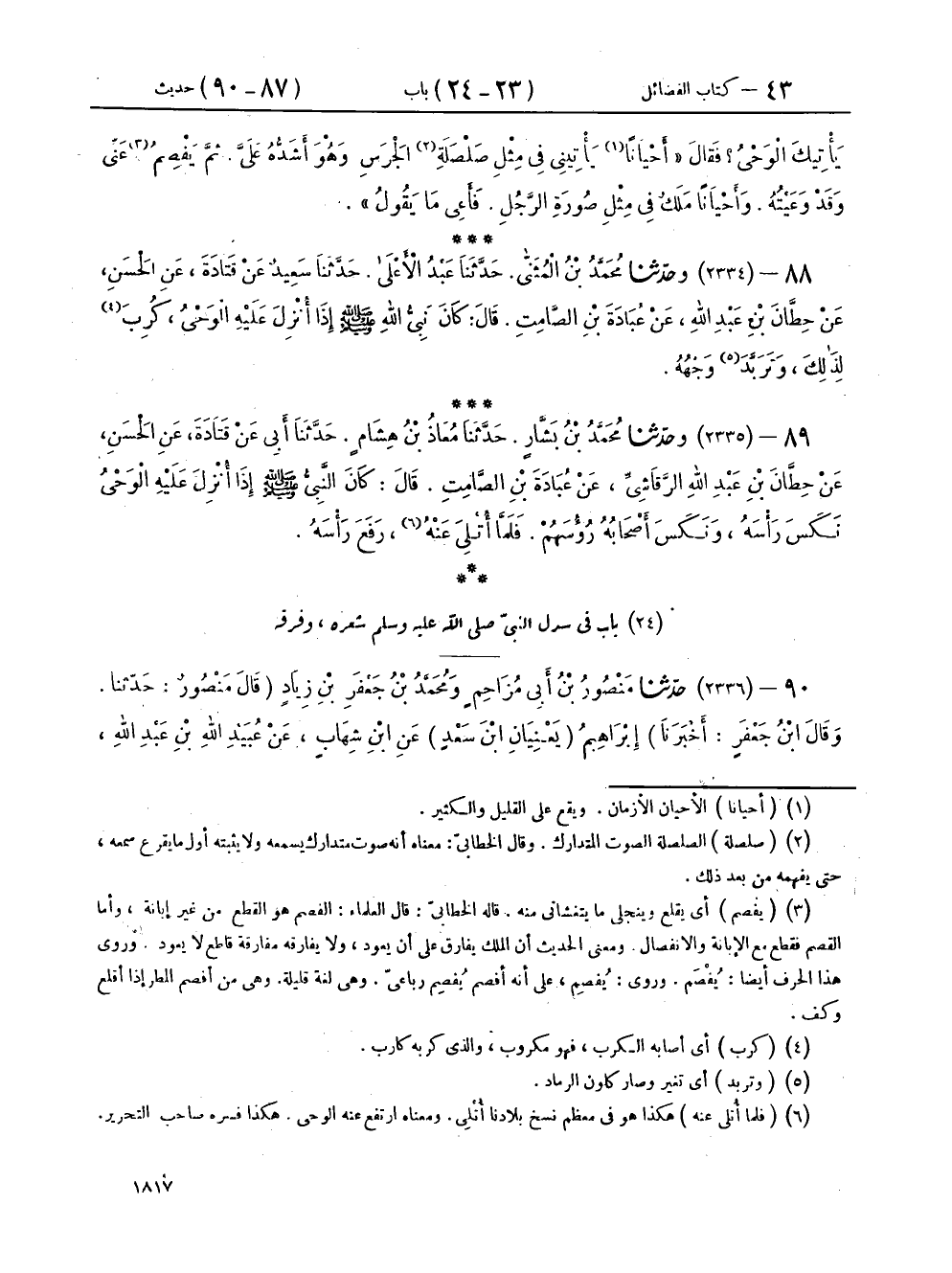 ٨٩ - (٢٣٣٥) وَحَدَّثَنَا مُحَمَّدُ بْنُ بَشَّارٍ، حَدَّثَنَا مُعَاذُ بْنُ هِشَامٍ، حَدَّثَنَا أَبِي، عَنْ قَتَادَةَ، عَنِ الْحَسَنِ، عَنْ حِطَّانَ بْنِ عَبْدِ اللهِ الرَّقَاشِيِّ، عَنْ عُبَادَةَ بْنِ الصَّامِتِ، قَالَ: «كَانَ النَّبِيُّ صَلَّى اللهُ عَلَيْهِ وَسَلَّمَ إِذَا أُنْزِلَ عَلَيْهِ الْوَحْيُ نَكَسَ رَأْسَهُ وَنَكَسَ أَصْحَابُهُ رُءُوسَهُمْ، فَلَمَّا أُتْلِيَ عَنْهُ رَفَعَ رَأْسَهُ»