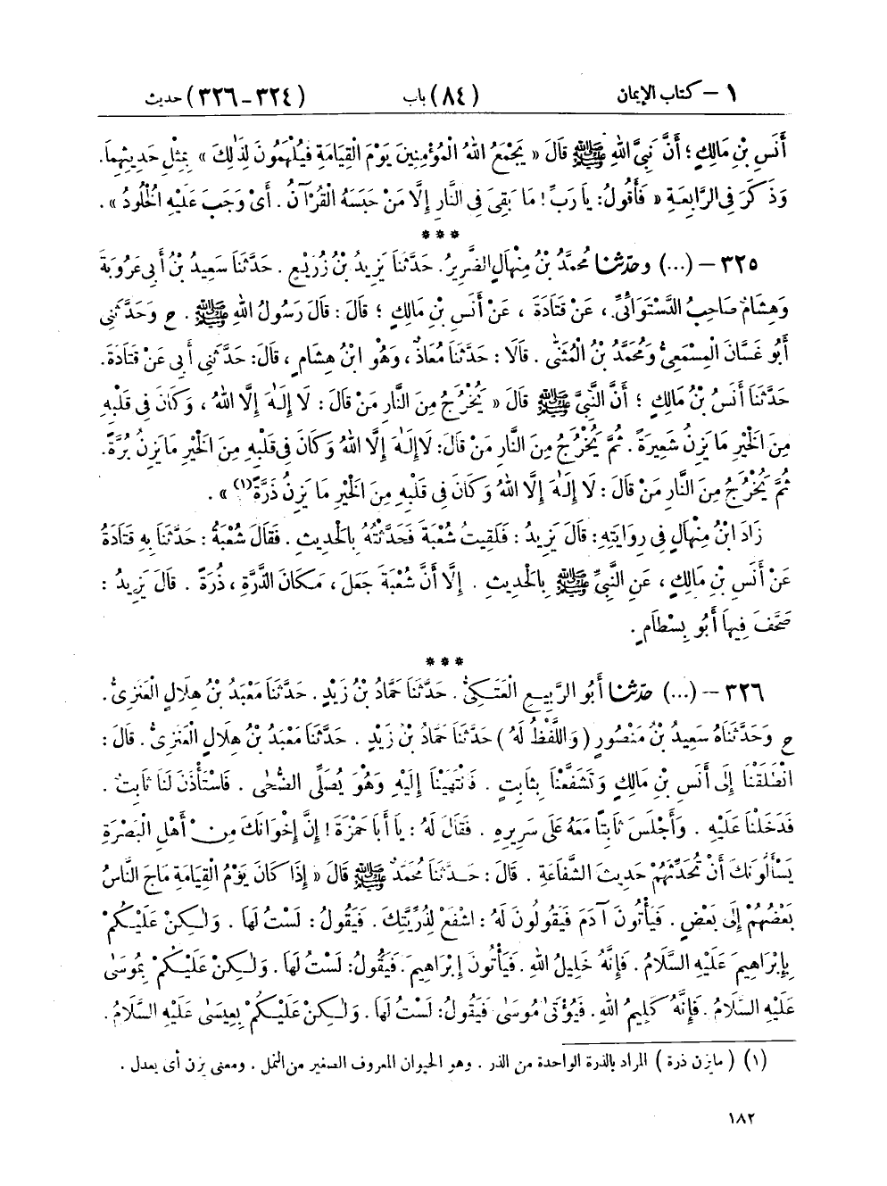 ٣٢٦ - (١٩٣) حَدَّثَنَا أَبُو الرَّبِيعِ الْعَتَكِيُّ، حَدَّثَنَا حَمَّادُ بْنُ زَيْدٍ، حَدَّثَنَا مَعْبَدُ بْنُ هِلَالٍ الْعَنَزِيُّ، ح، وَحَدَّثَنَاهُ سَعِيدُ بْنُ مَنْصُورٍ، وَاللَّفْظُ لَهُ، حَدَّثَنَا حَمَّادُ بْنُ زَيْدٍ، حَدَّثَنَا مَعْبَدُ بْنُ هِلَالٍ الْعَنَزِيُّ، قَالَ: انْطَلَقْنَا إِلَى أَنَسِ بْنِ مَالِكٍ، وَتَشَفَّعْنَا بِثَابِتٍ فَانْتَهَيْنَا إِلَيْهِ وَهُوَ يُصَلِّي الضُّحَى، فَاسْتَأْذَنَ لَنَا ثَابِتٌ، فَدَخَلْنَا عَلَيْهِ وَأَجْلَسَ ثَابِتًا مَعَهُ عَلَى سَرِيرِهِ، فَقَالَ: لَهُ يَا أَبَا حَمْزَةَ، إِنَّ إِخْوَانَكَ مِنْ أَهْلِ الْبَصْرَةِ يَسْأَلُونَكَ أَنْ تُحَدِّثَهُمْ حَدِيثَ الشَّفَاعَةِ، قَالَ: حَدَّثَنَا مُحَمَّدٌ صَلَّى اللهُ عَلَيْهِ وَسَلَّمَ قَالَ: " إِذَا كَانَ يَوْمُ الْقِيَامَةِ مَاجَ النَّاسُ بَعْضُهُمْ إِلَى بَعْضٍ، فَيَأْتُونَ آدَمَ فَيَقُولُونَ لَهُ: اشْفَعْ لِذُرِّيَّتِكَ، فَيَقُولُ: لَسْتُ لَهَا، وَلَكِنْ عَلَيْكُمْ بِإِبْرَاهِيمَ عَلَيْهِ السَّلَامُ، فَإِنَّهُ خَلِيلُ اللهِ، فَيَأْتُونَ إِبْرَاهِيمَ فَيَقُولُ: لَسْتُ لَهَا وَلَكِنْ عَلَيْكُمْ بِمُوسَى عَلَيْهِ السَّلَامُ، فَإِنَّهُ كَلِيمُ اللهِ، فَيُؤْتَى مُوسَى، فَيَقُولُ: لَسْتُ لَهَا، وَلَكِنْ عَلَيْكُمْ بِعِيسَى عَلَيْهِ السَّلَامُ ⦗١٨٣⦘، فَإِنَّهُ رُوحُ اللهِ وَكَلِمَتُهُ، فَيُؤتَى عِيسَى، فَيَقُولُ: لَسْتُ لَهَا، وَلَكِنْ عَلَيْكُمْ بِمُحَمَّدٍ صَلَّى اللهُ عَلَيْهِ وَسَلَّمَ، فَأُوتَى، فَأَقُولُ: أَنَا لَهَا، فَأَنْطَلِقُ فَأَسْتَأْذِنُ عَلَى رَبِّي، فَيُؤْذَنُ لِي، فَأَقُومُ بَيْنَ يَدَيْهِ فَأَحْمَدُهُ بِمَحَامِدَ لَا أَقْدِرُ عَلَيْهِ الْآنَ، يُلْهِمُنِيهِ اللهُ، ثُمَّ أَخِرُّ لَهُ سَاجِدًا، فَيُقَالُ لِي: يَا مُحَمَّدُ، ارْفَعْ رَأْسَكَ، وَقُلْ: يُسْمَعْ لَكَ، وَسَلْ تُعْطَهْ، وَاشْفَعْ تُشَفَّعْ، فَأَقُولُ: رَبِّ، أُمَّتِي أُمَّتِي، فَيُقَالُ: انْطَلِقْ، فَمَنْ كَانَ فِي قَلْبِهِ مِثْقَالُ حَبَّةٍ مِنْ بُرَّةٍ، أَوْ شَعِيرَةٍ مِنْ إِيمَانٍ، فَأَخْرِجْهُ مِنْهَا، فَأَنْطَلِقُ فَأَفْعَلُ، ثُمَّ أَرْجِعُ إِلَى رَبِّي فَأَحْمَدُهُ بِتِلْكَ الْمَحَامِدِ، ثُمَّ أَخِرُّ لَهُ سَاجِدًا، فَيُقَالُ لِي: يَا مُحَمَّدُ، ارْفَعْ رَأْسَكَ، وَقُلْ يُسْمَعْ لَكَ، وَسَلْ تُعْطَهْ، وَاشْفَعْ تُشَفَّعْ، فَأَقُولُ: أُمَّتِي أُمَّتِي، فَيُقَالُ لِي: انْطَلِقْ فَمَنْ كَانَ فِي قَلْبِهِ مِثْقَالُ حَبَّةٍ مِنْ خَرْدَلٍ مِنْ إِيمَانٍ فَأَخْرِجْهُ مِنْهَا، فَأَنْطَلِقُ فَأَفْعَلُ، ثُمَّ أَعُودُ إِلَى رَبِّي فَأَحْمَدُهُ بِتِلْكَ الْمَحَامِدِ، ثُمَّ أَخِرُّ لَهُ سَاجِدًا، فَيُقَالُ لِي: يَا مُحَمَّدُ، ارْفَعْ رَأْسَكَ، وَقُلْ يُسْمَعْ لَكَ، وَسَلْ تُعْطَهْ، وَاشْفَعْ تُشَفَّعْ، فَأَقُولُ: يَا رَبِّ، أُمَّتِي أُمَّتِي، فَيُقَالُ لِي: انْطَلِقْ فَمَنْ كَانَ فِي قَلْبِهِ أَدْنَى أَدْنَى أَدْنَى مِنْ مِثْقَالِ حَبَّةٍ مِنْ خَرْدَلٍ مِنْ إِيمَانٍ فَأَخْرِجْهُ مِنَ النَّارِ فَأَنْطَلِقُ فَأَفْعَلُ "، هَذَا حَدِيثُ أَنَسٍ الَّذِي أَنْبَأَنَا بِهِ، فَخَرَجْنَا مِنْ عِنْدِهِ، فَلَمَّا كُنَّا بِظَهْرِ الْجَبَّانِ، قُلْنَا: لَوْ مِلْنَا إِلَى الْحَسَنِ فَسَلَّمْنَا عَلَيْهِ وَهُوَ مُسْتَخْفٍ فِي دَارِ أَبِي خَلِيفَةَ، قَالَ: فَدَخَلْنَا عَلَيْهِ، فَسَلَّمْنَا عَلَيْهِ، فَقُلْنَا: يَا أَبَا سَعِيدٍ، جِئْنَا مِنْ عِنْدِ أَخِيكَ أَبِي حَمْزَةَ، فَلَمْ نَسْمَعْ مِثْلَ حَدِيثٍ حَدَّثَنَاهُ فِي الشَّفَاعَةِ، قَالَ: هِيَهِ، فَحَدَّثْنَاهُ الْحَدِيثَ، فَقَالَ: هِيَهِ قُلْنَا: مَا زَادَنَا، قَالَ: قَدْ حَدَّثَنَا بِهِ مُنْذُ عِشْرِينَ سَنَةً وَهُوَ يَوْمَئِذٍ جَمِيعٌ، وَلَقَدْ تَرَكَ شَ
