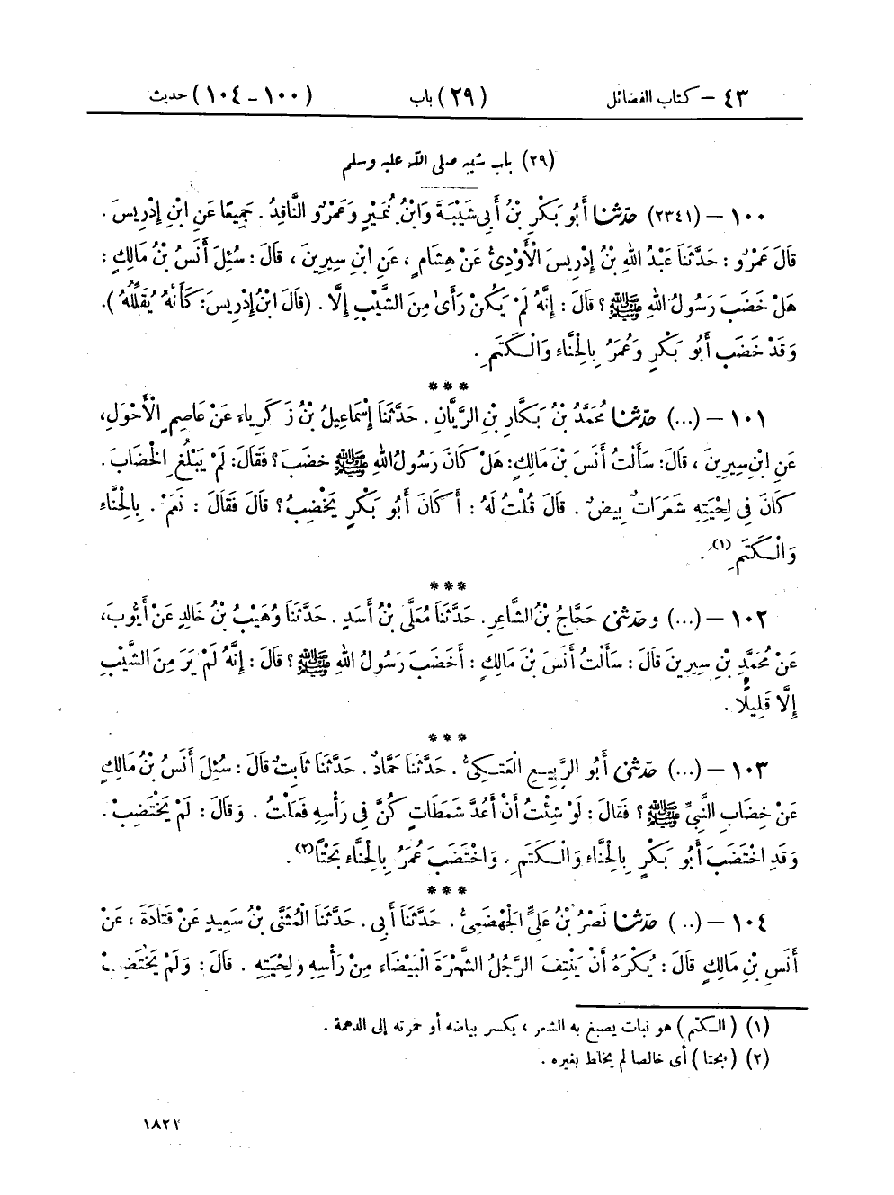 ١٠٣ - (٢٣٤١) حَدَّثَنِي أَبُو الرَّبِيعِ الْعَتَكِيُّ، حَدَّثَنَا حَمَّادٌ، حَدَّثَنَا ثَابِتٌ، قَالَ: سُئِلَ أَنَسُ بْنُ مَالِكٍ عَنْ خِضَابِ النَّبِيِّ صَلَّى اللهُ عَلَيْهِ وَسَلَّمَ؟ فَقَالَ: «لَوْ شِئْتُ أَنْ أَعُدَّ شَمَطَاتٍ كُنَّ فِي رَأْسِهِ فَعَلْتُ»، وَقَالَ: لَمْ يَخْتَضِبْ «وَقَدِ اخْتَضَبَ أَبُو بَكْرٍ بِالْحِنَّاءِ وَالْكَتَمِ» وَاخْتَضَبَ عُمَرُ بِالْحِنَّاءِ بَحْتًا "