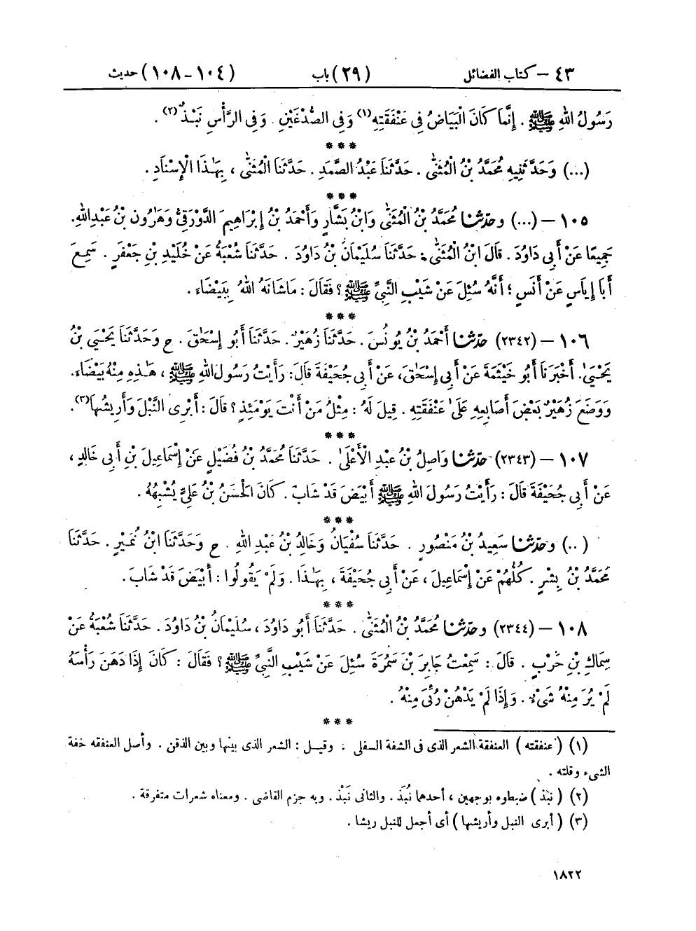 ١٠٦ - (٢٣٤٢) حَدَّثَنَا أَحْمَدُ بْنُ يُونُسَ، حَدَّثَنَا زُهَيْرٌ، حَدَّثَنَا أَبُو إِسْحَاقَ، ح وَحَدَّثَنَا يَحْيَى بْنُ يَحْيَى، أَخْبَرَنَا أَبُو خَيْثَمَةَ، عَنْ أَبِي إِسْحَاقَ، عَنْ أَبِي جُحَيْفَةَ، قَالَ: رَأَيْتُ رَسُولَ اللهِ صَلَّى اللهُ عَلَيْهِ وَسَلَّمَ، «هَذِهِ مِنْهُ بَيْضَاءَ، وَوَضَعَ زُهَيْرٌ بَعْضَ أَصَابِعِهِ عَلَى عَنْفَقَتِهِ» قِيلَ لَهُ: مِثْلُ مَنْ أَنْتَ يَوْمَئِذٍ؟ فَقَالَ: «أَبْرِي النَّبْلَ وَأَرِيشُهَا»