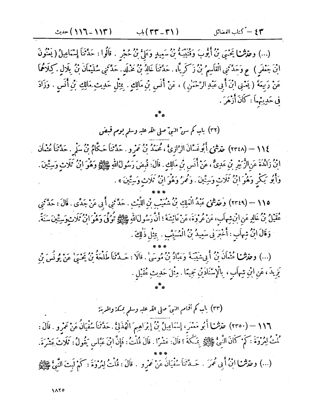 ١١٤ - (٢٣٤٨) حَدَّثَنِي أَبُو غَسَّانَ الرَّازِيُّ مُحَمَّدُ بْنُ عَمْرٍو، حَدَّثَنَا حَكَّامُ بْنُ سَلْمٍ، حَدَّثَنَا عُثْمَانُ بْنُ زَائِدَةَ، عَنِ الزُّبَيْرِ بْنِ عَدِيٍّ، عَنْ أَنَسِ بْنِ مَالِكٍ، قَالَ: «قُبِضَ رَسُولُ اللهِ صَلَّى اللهُ عَلَيْهِ وَسَلَّمَ وَهُوَ ابْنُ ثَلَاثٍ وَسِتِّينَ، وَأَبُو بَكْرٍ وَهُوَ ابْنُ ثَلَاثٍ وَسِتِّينَ، وَعُمَرُ وَهُوَ ابْنُ ثَلَاثٍ وَسِتِّينَ»
