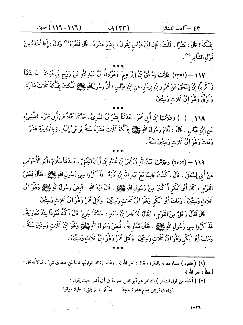 ١١٨ - (٢٣٥١) وَحَدَّثَنَا ابْنُ أَبِي عُمَرَ، حَدَّثَنَا بِشْرُ بْنُ السَّرِيِّ، حَدَّثَنَا حَمَّادٌ، عَنْ أَبِي جَمْرَةَ الضُّبَعِيِّ، عَنِ ابْنِ عَبَّاسٍ، قَالَ: «أَقَامَ رَسُولُ اللهِ صَلَّى اللهُ عَلَيْهِ وَسَلَّمَ بِمَكَّةَ ثَلَاثَ عَشْرَةَ سَنَةً يُوحَى إِلَيْهِ، وَبِالْمَدِينَةِ عَشْرًا وَمَاتَ وَهُوَ ابْنُ ثَلَاثٍ وَسِتِّينَ سَنَةً»