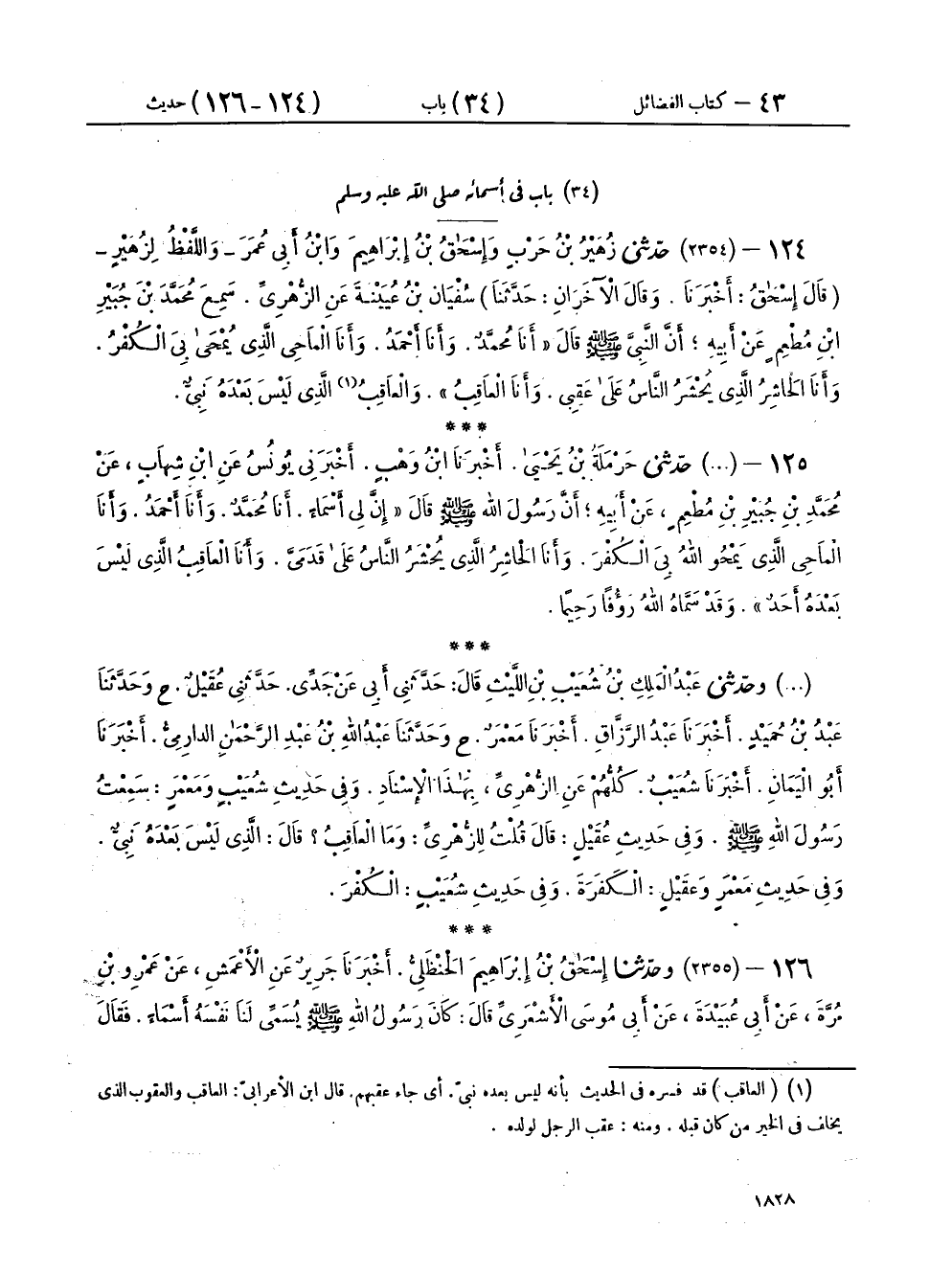 ١٢٤ - (٢٣٥٤) حَدَّثَنِي زُهَيْرُ بْنُ حَرْبٍ، وَإِسْحَاقُ بْنُ إِبْرَاهِيمَ، وَابْنُ أَبِي عُمَرَ - وَاللَّفْظُ لِزُهَيْرٍ، قَالَ إِسْحَاقُ: أَخْبَرَنَا، وقَالَ الْآخَرَانِ: حَدَّثَنَا - سُفْيَانُ بْنُ عُيَيْنَةَ، عَنِ الزُّهْرِيِّ، سَمِعَ مُحَمَّدَ بْنَ جُبَيْرِ بْنِ مُطْعِمٍ، عَنْ أَبِيهِ، أَنَّ النَّبِيَّ صَلَّى اللهُ عَلَيْهِ وَسَلَّمَ، قَالَ: «أَنَا مُحَمَّدٌ، وَأَنَا أَحْمَدُ، وَأَنَا الْمَاحِي، الَّذِي يُمْحَى بِيَ الْكُفْرُ، وَأَنَا الْحَاشِرُ الَّذِي يُحْشَرُ النَّاسُ عَلَى عَقِبِي، وَأَنَا الْعَاقِبُ وَالْعَاقِبُ الَّذِي لَيْسَ بَعْدَهُ نَبِيٌّ»