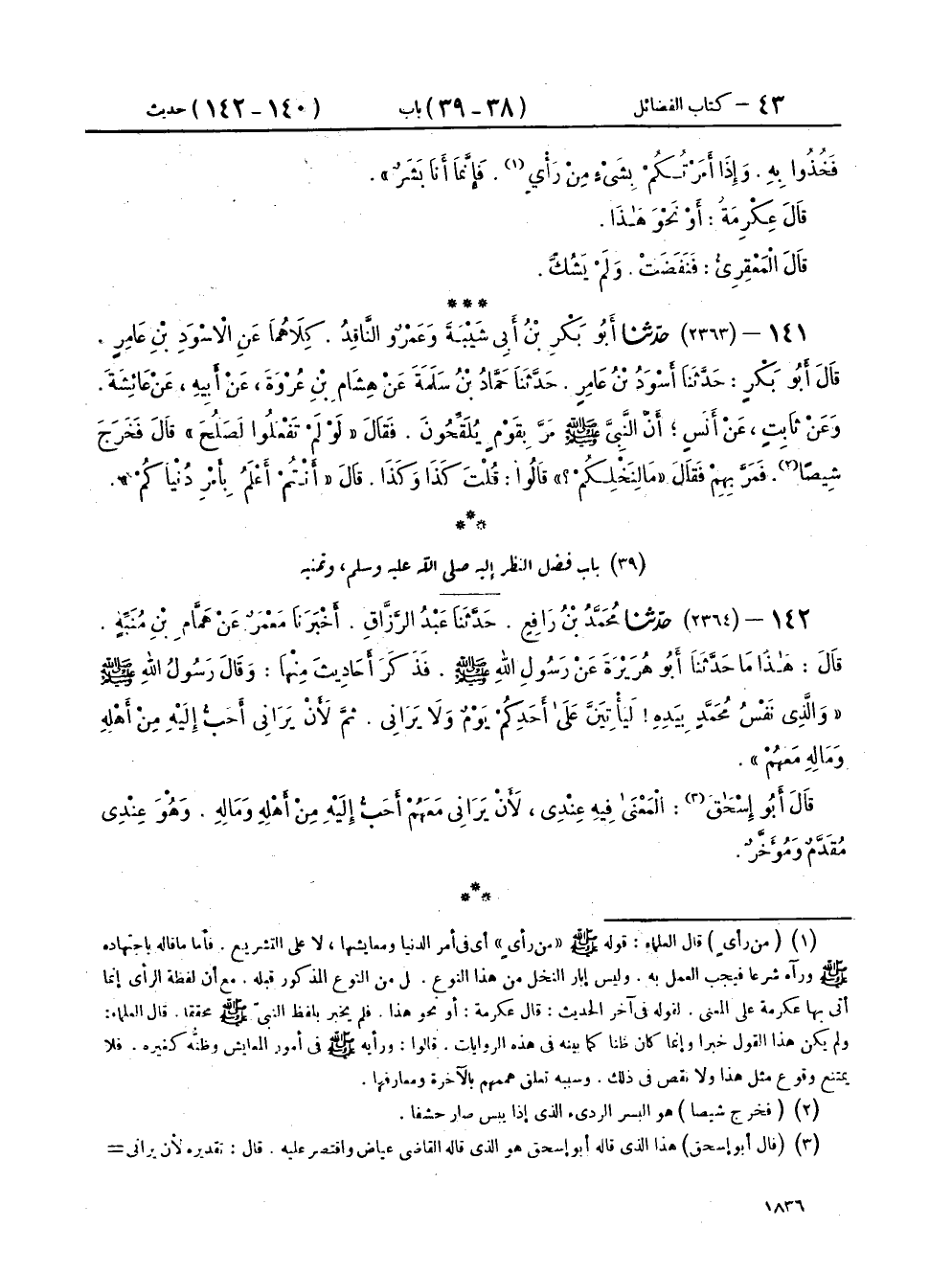 ١٤١ - (٢٣٦٣) حَدَّثَنَا أَبُو بَكْرِ بْنُ أَبِي شَيْبَةَ، وَعَمْرٌو النَّاقِدُ، كِلَاهُمَا عَنِ الْأَسْوَدِ بْنِ عَامِرٍ، قَالَ: أَبُو بَكْرٍ، حَدَّثَنَا أَسْوَدُ بْنُ عَامِرٍ، حَدَّثَنَا حَمَّادُ بْنُ سَلَمَةَ، عَنْ هِشَامِ بْنِ عُرْوَةَ، عَنْ أَبِيهِ، عَنْ عَائِشَةَ، وَعَنْ ثَابِتٍ، عَنْ أَنَسٍ، أَنَّ النَّبِيَّ صَلَّى اللهُ عَلَيْهِ وَسَلَّمَ مَرَّ بِقَوْمٍ يُلَقِّحُونَ، فَقَالَ: «لَوْ لَمْ تَفْعَلُوا لَصَلُحَ» قَالَ: فَخَرَجَ شِيصًا، فَمَرَّ بِهِمْ فَقَالَ: «مَا لِنَخْلِكُمْ؟» قَالُوا: قُلْتَ كَذَا وَكَذَا، قَالَ: «أَنْتُمْ أَعْلَمُ بِأَمْرِ دُنْيَاكُمْ»