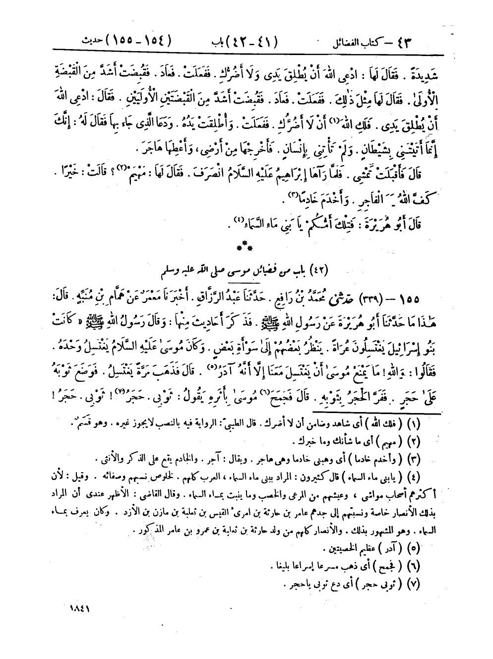 ١٥٥ - (٣٣٩) حَدَّثَنِي مُحَمَّدُ بْنُ رَافِعٍ، حَدَّثَنَا عَبْدُ الرَّزَّاقِ، أَخْبَرَنَا مَعْمَرٌ، عَنْ هَمَّامِ بْنِ مُنَبِّهٍ، قَالَ: هَذَا مَا حَدَّثَنَا أَبُو هُرَيْرَةَ، عَنْ رَسُولِ اللهِ صَلَّى اللهُ عَلَيْهِ وَسَلَّمَ، فَذَكَرَ أَحَادِيثَ مِنْهَا، وَقَالَ رَسُولُ اللهِ صَلَّى اللهُ عَلَيْهِ وَسَلَّمَ: " كَانَتْ بَنُو إِسْرَائِيلَ يَغْتَسِلُونَ عُرَاةً، يَنْظُرُ بَعْضُهُمْ إِلَى سَوْأَةِ بَعْضٍ، وَكَانَ مُوسَى عَلَيْهِ السَّلَامُ يَغْتَسِلُ وَحْدَهُ، فَقَالُوا: وَاللهِ مَا يَمْنَعُ مُوسَى أَنْ يَغْتَسِلَ مَعَنَا إِلَّا أَنَّهُ آدَرُ، قَالَ: فَذَهَبَ مَرَّةً يَغْتَسِلُ، فَوَضَعَ ثَوْبَهُ عَلَى حَجَرٍ، فَفَرَّ الْحَجَرُ بِثَوْبِهِ، قَالَ فَجَمَحَ مُوسَى بِأَثَرِهِ يَقُولُ: ثَوْبِي، حَجَرُ ثَوْبِي، حَجَرُ حَتَّى نَظَرَتْ بَنُو إِسْرَائِيلَ إِلَى سَوْأَةِ مُوسَى فَقَالُوا: وَاللهِ مَا بِمُوسَى مِنْ بَأْسٍ، فَقَامَ الْحَجَرُ بَعْدُ، حَتَّى نُظِرَ إِلَيْهِ، قَالَ فَأَخَذَ ثَوْبَهُ فَطَفِقَ بِالْحَجَرِ ضَرْبًا " قَالَ أَبُو هُرَيْرَةَ: وَاللهِ إِنَّهُ بِالْحَجَرِ نَدَبٌ سِتَّةٌ أَوْ سَبْعَةٌ، ضَرْبُ مُوسَى عَلَيْهِ السَّلَامُ بِالْحَجَرِ