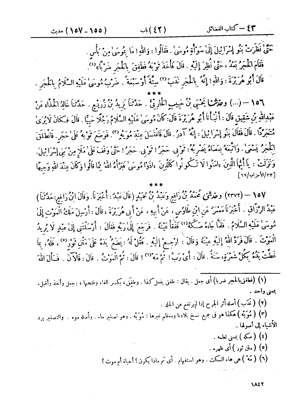 ١٥٦ - (٣٣٩) وَحَدَّثَنَا يَحْيَى بْنُ حَبِيبٍ الْحَارِثِيُّ، حَدَّثَنَا يَزِيدُ بْنُ زُرَيْعٍ، حَدَّثَنَا خَالِدٌ الْحَذَّاءُ، عَنْ عَبْدِ اللهِ بْنِ شَقِيقٍ، قَالَ: أَنْبَأَنَا أَبُو هُرَيْرَةَ، قَالَ: " كَانَ مُوسَى عَلَيْهِ السَّلَامُ رَجُلًا حَيِيًّا، قَالَ فَكَانَ لَا يُرَى مُتَجَرِّدًا، قَالَ فَقَالَ: بَنُو إِسْرَائِيلَ: إِنَّهُ آدَرُ، قَالَ: فَاغْتَسَلَ عِنْدَ مُوَيْهٍ، فَوَضَعَ ثَوْبهُ عَلَى حَجَرٍ، فَانْطَلَقَ الْحَجَرُ يَسْعَى، وَاتَّبَعَهُ بِعَصَاهُ يَضْرِبُهُ: ثَوْبِي، حَجَرُ ثَوْبِي، حَجَرُ حَتَّى وَقَفَ عَلَى مَلَأٍ مِنْ بَنِي إِسْرَائِيلَ وَنَزَلَتْ {يَا أَيُّهَا الَّذِينَ آمَنُوا لَا تَكُونُوا كَالَّذِينَ آذَوْا مُوسَى فَبَرَّأَهُ اللهُ مِمَّا قَالُوا وَكَانَ عِنْدَ اللهِ وَجِيهًا} [الأحزاب: ٦٩]