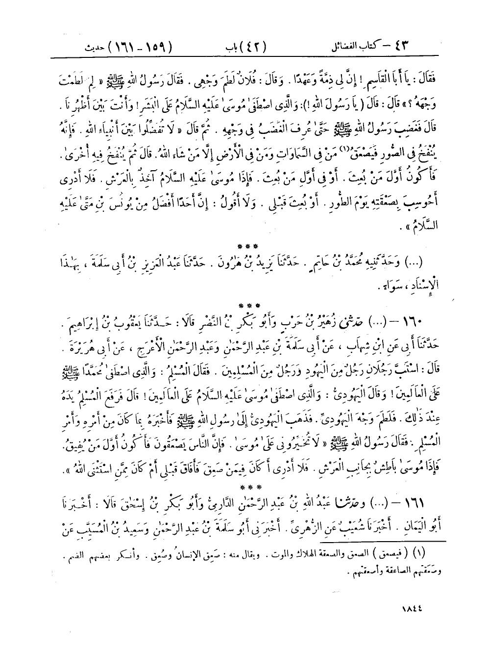 ١٦٠ - (٢٣٧٣) حَدَّثَنِي زُهَيْرُ بْنُ حَرْبٍ، وَأَبُو بَكْرِ بْنُ النَّضْرِ، قَالَا: حَدَّثَنَا يَعْقُوبُ بْنُ إِبْرَاهِيمَ، حَدَّثَنَا أَبِي، عَنِ ابْنِ شِهَابٍ، عَنْ أَبِي سَلَمَةَ بْنِ عَبْدِ الرَّحْمَنِ، وَعَبْدِ الرَّحْمَنِ الْأَعْرَجِ، عَنْ أَبِي هُرَيْرَةَ، قَالَ: اسْتَبَّ رَجُلَانِ رَجُلٌ مِنَ الْيَهُودِ وَرَجُلٌ مِنَ الْمُسْلِمِينَ فَقَالَ: الْمُسْلِمُ وَالَّذِي اصْطَفَى مُحَمَّدًا صَلَّى اللهُ عَلَيْهِ وَسَلَّمَ عَلَى الْعَالَمِينَ وَقَالَ الْيَهُودِيُّ: وَالَّذِي اصْطَفَى مُوسَى عَلَيْهِ السَّلَامُ عَلَى الْعَالَمِينَ قَالَ فَرَفَعَ الْمُسْلِمُ يَدَهُ عِنْدَ ذَلِكَ، فَلَطَمَ وَجْهَ الْيَهُودِيِّ، فَذَهَبَ الْيَهُودِيُّ إِلَى رَسُولِ اللهِ صَلَّى اللهُ عَلَيْهِ وَسَلَّمَ، فَأَخْبَرَهُ بِمَا كَانَ مِنْ أَمْرِهِ وَأَمْرِ الْمُسْلِمِ، فَقَالَ رَسُولُ اللهِ صَلَّى اللهُ عَلَيْهِ وَسَلَّمَ: «لَا تُخَيِّرُونِي عَلَى مُوسَى، فَإِنَّ النَّاسَ يَصْعَقُونَ فَأَكُونُ أَوَّلَ مَنْ يُفِيقُ، فَإِذَا مُوسَى بَاطِشٌ بِجَانِبِ الْعَرْشِ، فَلَا أَدْرِي أَكَانَ، فِيمَنْ صَعِقَ فَأَفَاقَ قَبْلِي أَمْ كَانَ مِمَّنِ اسْتَثْنَى اللهُ»
