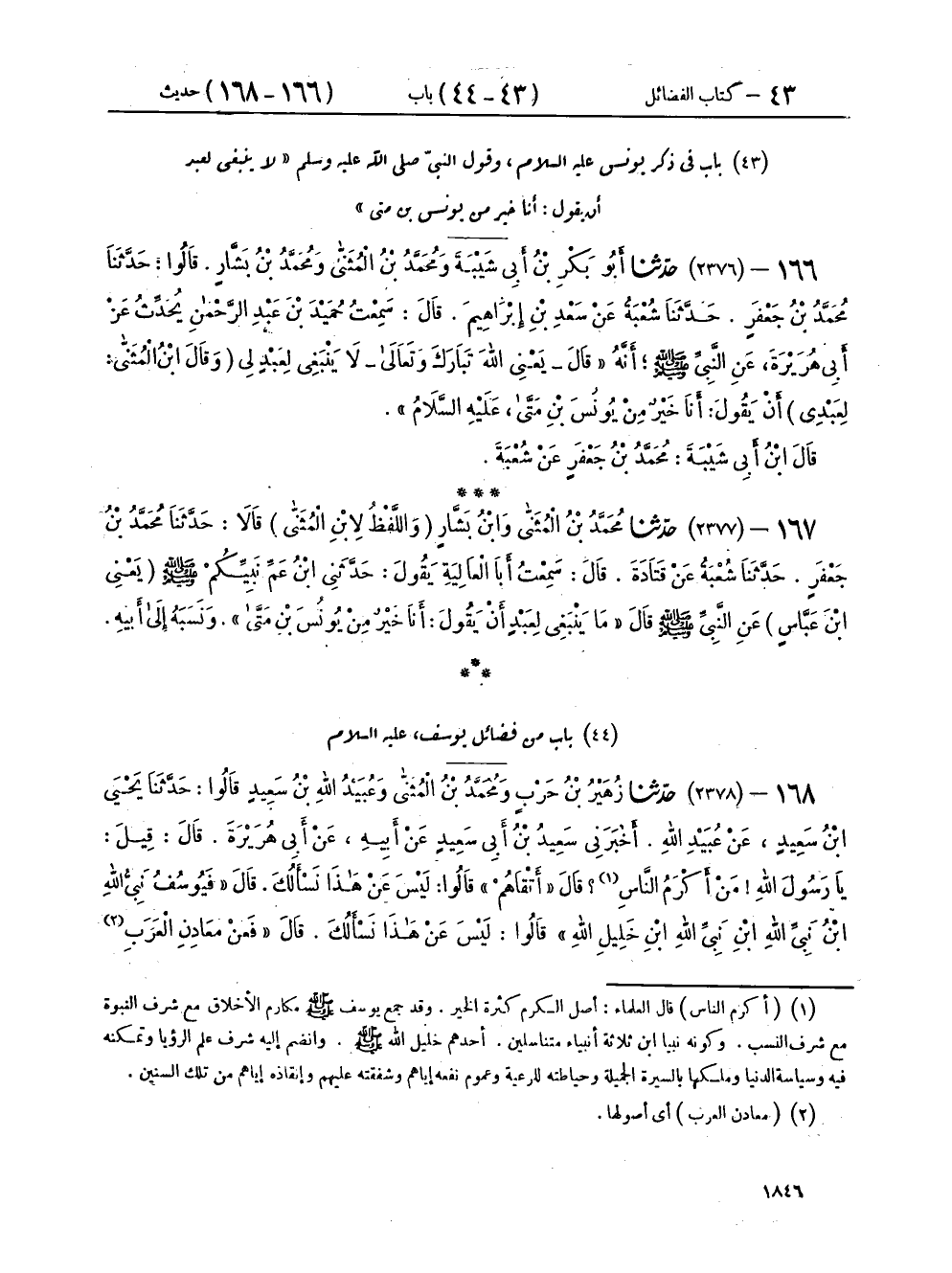 ١٦٦ - (٢٣٧٦) حَدَّثَنَا أَبُو بَكْرِ بْنُ أَبِي شَيْبَةَ، وَمُحَمَّدُ بْنُ الْمُثَنَّى، وَمُحَمَّدُ بْنُ بَشَّارٍ، قَالُوا: حَدَّثَنَا مُحَمَّدُ بْنُ جَعْفَرٍ، حَدَّثَنَا شُعْبَةُ، عَنْ سَعْدِ بْنِ إِبْرَاهِيمَ، قَالَ: سَمِعْتُ حُمَيْدَ بْنَ عَبْدِ الرَّحْمَنِ، يُحَدِّثُ عَنْ أَبِي هُرَيْرَةَ، عَنِ النَّبِيِّ صَلَّى اللهُ عَلَيْهِ وَسَلَّمَ، أَنَّهُ " قَالَ - يَعْنِي اللهَ تَبَارَكَ وَتَعَالَى - لَا يَنْبَغِي لِعَبْدٍ لِي - وقَالَ ابْنُ الْمُثَنَّى: لِعَبْدِي - أَنْ يَقُولَ: أَنَا خَيْرٌ مِنْ يُونُسَ بْنِ مَتَّى عَلَيْهِ السَّلَامُ " قَالَ: ابْنُ أَبِي شَيْبَةَ مُحَمَّدُ بْنُ جَعْفَرٍ، عَنْ شُعْبَةَ