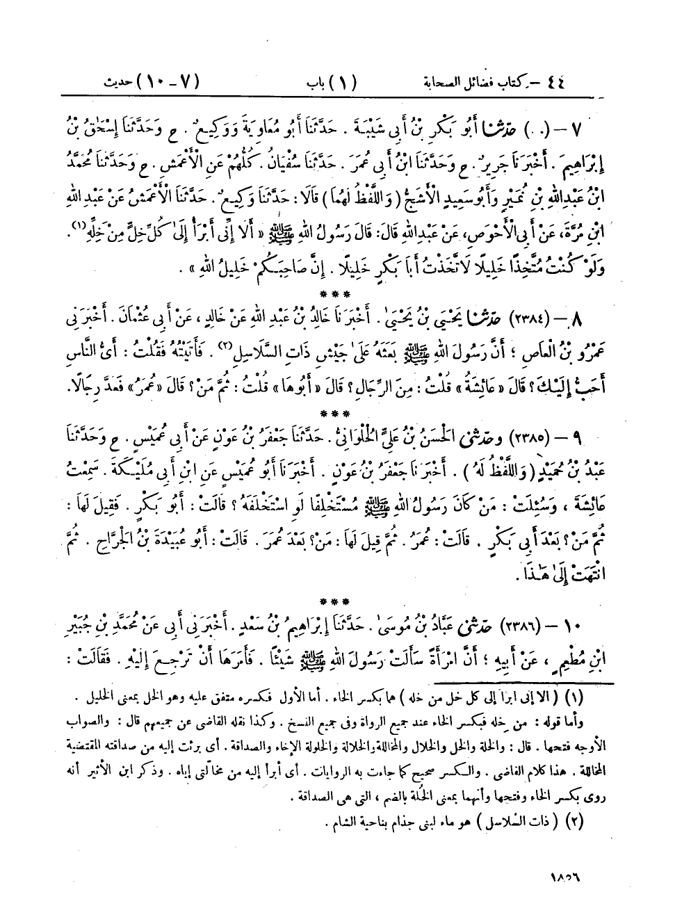 ٧ - (٢٣٨٣) حَدَّثَنَا أَبُو بَكْرِ بْنُ أَبِي شَيْبَةَ، حَدَّثَنَا أَبُو مُعَاوِيَةَ، وَوَكِيعٌ، ح وَحَدَّثَنَا إِسْحَاقُ بْنُ إِبْرَاهِيمَ، أَخْبَرَنَا جَرِيرٌ، ح وَحَدَّثَنَا ابْنُ أَبِي عُمَرَ، حَدَّثَنَا سُفْيَانُ، كُلُّهُمْ عَنِ الْأَعْمَشِ، ح وَحَدَّثَنَا مُحَمَّدُ بْنُ عَبْدِ اللهِ بْنِ نُمَيْرٍ، وَأَبُو سَعِيدٍ الْأَشَجُّ - وَاللَّفْظُ لَهُمَا - قَالَا: حَدَّثَنَا وَكِيعٌ، حَدَّثَنَا الْأَعْمَشُ، عَنْ عَبْدِ اللهِ بْنِ مُرَّةَ، عَنْ أَبِي الْأَحْوَصِ، عَنْ عَبْدِ اللهِ، قَالَ: قَالَ رَسُولُ اللهِ صَلَّى اللهُ عَلَيْهِ وَسَلَّمَ: «أَلَا إِنِّي أَبْرَأُ إِلَى كُلِّ خِلٍّ مِنْ خِلِّهِ، وَلَوْ كُنْتُ مُتَّخِذًا خَلِيلًا، لَاتَّخَذْتُ أَبَا بَكْرٍ خَلِيلًا، إِنَّ صَاحِبَكُمْ خَلِيلُ اللهِ»
