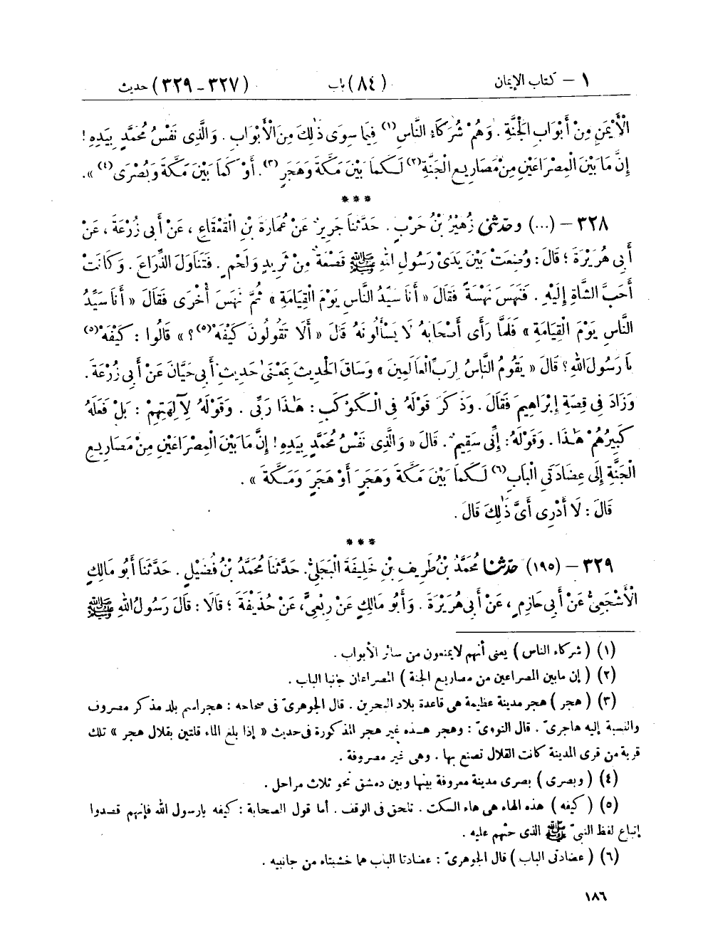 ٣٢٨ - (١٩٤) وَحَدَّثَنِي زُهَيْرُ بْنُ حَرْبٍ، حَدَّثَنَا جَرِيرٌ، عَنْ عُمَارَةَ بْنِ الْقَعْقَاعِ، عَنْ أَبِي زُرْعَةَ، عَنْ أَبِي هُرَيْرَةَ، قَالَ: وُضِعَتْ بَيْنَ يَدَيْ رَسُولِ اللهِ صَلَّى اللهُ عَلَيْهِ وَسَلَّمَ قَصْعَةٌ مِنْ ثَرِيدٍ وَلَحْمٍ، فَتَنَاوَلَ الذِّرَاعَ وَكَانَتْ أَحَبَّ الشَّاةِ إِلَيْهِ، فَنَهَسَ نَهْسَةً، فَقَالَ: «أَنَا سَيِّدُ النَّاسِ يَوْمَ الْقِيَامَةِ»، ثُمَّ نَهَسَ أُخْرَى، فَقَالَ: «أَنَا سَيِّدُ النَّاسِ يَوْمَ الْقِيَامَةِ»، فَلَمَّا رَأَى أَصْحَابَهُ لَا يَسْأَلُونَهُ قَالَ: «أَلَا تَقُولُونَ كَيْفَهْ؟» قَالُوا: كَيْفَهْ يَا رَسُولَ اللهِ؟ قَالَ: «يَقُومُ النَّاسُ لِرَبِّ الْعَالَمِينَ» وَسَاقَ الْحَدِيثَ بِمَعْنَى حَدِيثِ أَبِي حَيَّانَ، عَنْ أَبِي زُرْعَةَ، وَزَادَ فِي قِصَّةِ إِبْرَاهِيمَ فَقَالَ: وَذَكَرَ قَوْلَهُ فِي الْكَوْكَبِ: ِ {هَذَا رَبِّي} [الأنعام: ٧٦] وَقَوْلَهُ لِآلِهَتِهِمْ: {بَلْ فَعَلَهُ كَبِيرُهُمْ هَذَا} [الأنبياء: ٦٣]، وَقَوْلَهُ: {إِنِّي سَقِيمٌ} [الصافات: ٨٩]، قَالَ: " وَالَّذِي نَفْسُ مُحَمَّدٍ بِيَدِهِ، إِنَّ مَا بَيْنَ الْمِصْرَاعَيْنِ مِنْ مَصَارِيعِ الْجَنَّةِ إِلَى عِضَادَتَيِ الْبَابُِ لَكَمَا بَيْنَ مَكَّةَ وَهَجَرٍ، أَوْ هَجَرٍ وَمَكَّةَ، قَالَ: لَا أَدْرِي أَيَّ ذَلِكَ قَالَ