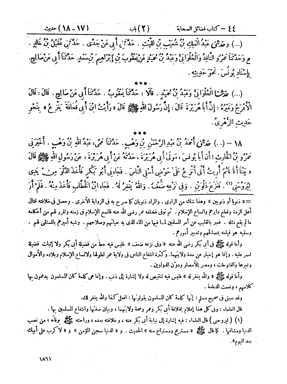 ١٨ - (٢٣٩٢) حَدَّثَنِي أَحْمَدُ بْنُ عَبْدِ الرَّحْمَنِ بْنِ وَهْبٍ، حَدَّثَنَا عَمِّي عَبْدُ اللهِ بْنُ وَهْبٍ، أَخْبَرَنِي عَمْرُو بْنُ الْحَارِثِ، أَنَّ أَبَا يُونُسَ، مَوْلَى أَبِي هُرَيْرَةَ، حَدَّثَهُ عَنْ أَبِي هُرَيْرَةَ، عَنْ رَسُولِ اللهِ صَلَّى اللهُ عَلَيْهِ وَسَلَّمَ، قَالَ: «بَيْنَا أَنَا نَائِمٌ أُرِيتُ أَنِّي أَنْزِعُ عَلَى حَوْضِي أَسْقِي النَّاسَ، فَجَاءَنِي أَبُو بَكْرٍ فَأَخَذَ الدَّلْوَ مِنْ يَدِي لِيُرَوِّحَنِي، فَنَزَعَ دَلْوَيْنِ، وَفِي نَزْعِهِ ضَعْفٌ، وَاللهُ يَغْفِرُ لَهُ، فَجَاءَ ابْنُ الْخَطَّابِ فَأَخَذَ مِنْهُ، فَلَمْ أَرَ نَزْعَ رَجُلٍ قَطُّ أَقْوَى مِنْهُ، حَتَّى تَوَلَّى النَّاسُ، وَالْحَوْضُ مَلْآنُ يَتَفَجَّرُ»