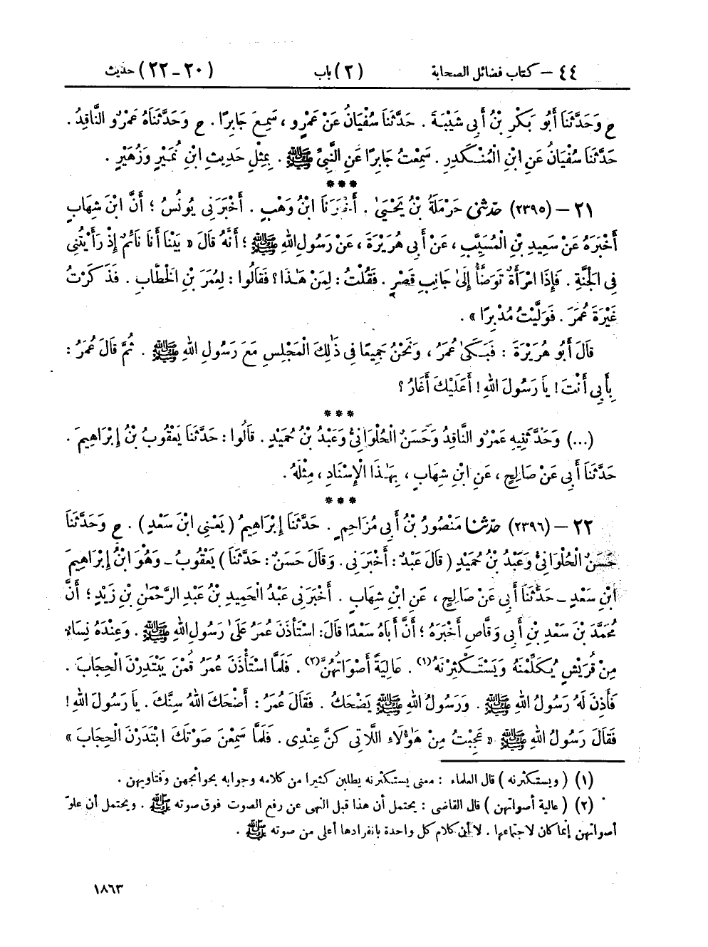 ٢١ - (٢٣٩٥) حَدَّثَنِي حَرْمَلَةُ بْنُ يَحْيَى، أَخْبَرَنَا ابْنُ وَهْبٍ، أَخْبَرَنِي يُونُسُ، أَنَّ ابْنَ شِهَابٍ، أَخْبَرَهُ عَنْ سَعِيدِ بْنِ الْمُسَيِّبِ، عَنْ أَبِي هُرَيْرَةَ، عَنْ رَسُولِ اللهِ صَلَّى اللهُ عَلَيْهِ وَسَلَّمَ، أَنَّهُ قَالَ: " بَيْنَا أَنَا نَائِمٌ إِذْ رَأَيْتُنِي فِي الْجَنَّةِ، فَإِذَا امْرَأَةٌ تَوَضَّأُ إِلَى جَانِبِ قَصْرٍ، فَقُلْتُ: لِمَنْ هَذَا؟ فَقَالُوا: لِعُمَرَ بْنِ الْخَطَّابِ، فَذَكَرْتُ غَيْرَةَ عُمَرَ، فَوَلَّيْتُ مُدْبِرًا " قَالَ أَبُو هُرَيْرَةَ فَبَكَى عُمَرُ، وَنَحْنُ جَمِيعًا فِي ذَلِكَ الْمَجْلِسِ مَعَ رَسُولِ اللهِ صَلَّى اللهُ عَلَيْهِ وَسَلَّمَ، ثُمَّ قَالَ عُمَرُ: بِأَبِي أَنْتَ يَا رَسُولَ اللهِ أَعَلَيْكَ أَغَارُ؟