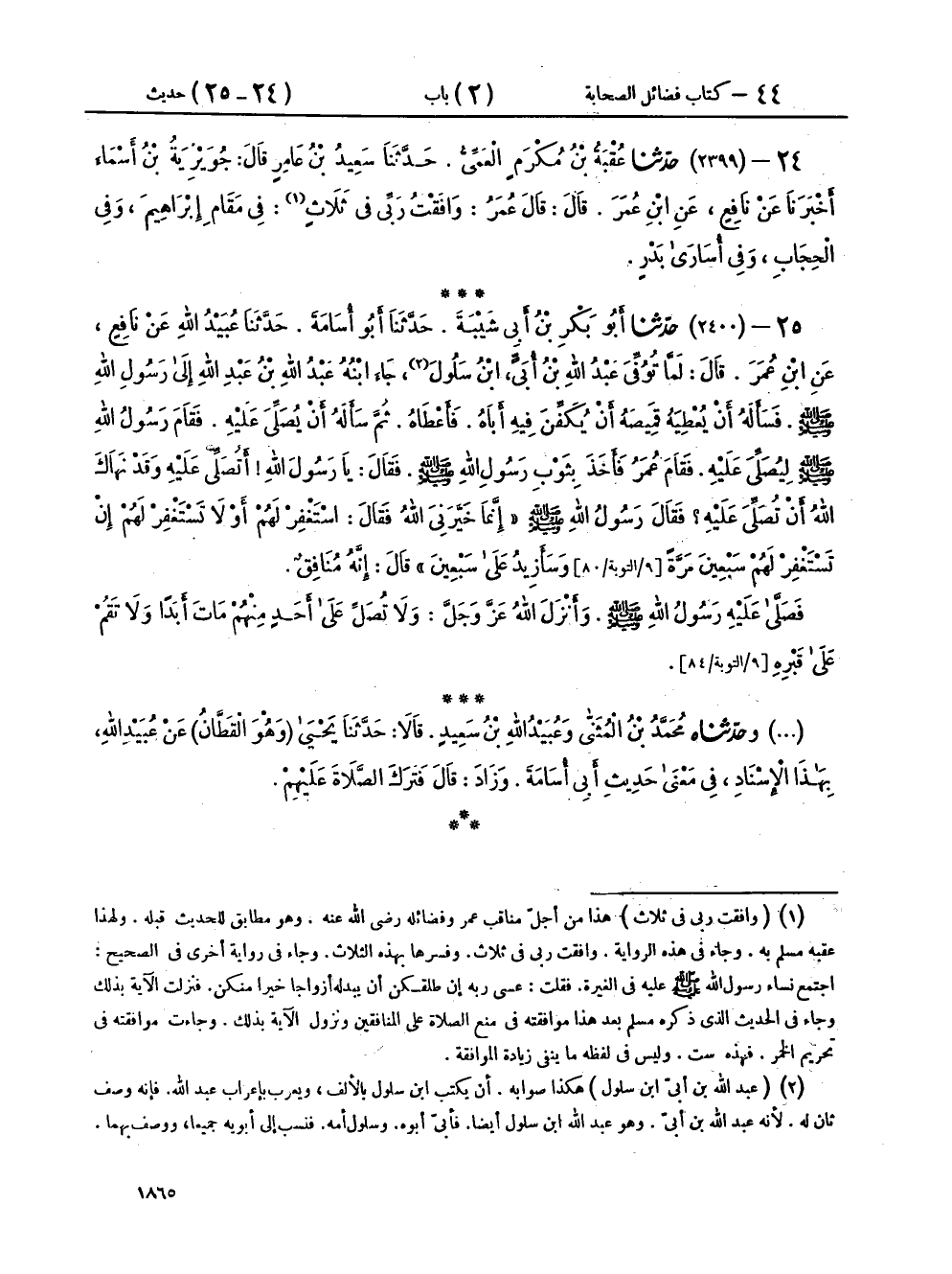 ٢٥ - (٢٤٠٠) حَدَّثَنَا أَبُو بَكْرِ بْنُ أَبِي شَيْبَةَ، حَدَّثَنَا أَبُو أُسَامَةَ، حَدَّثَنَا عُبَيْدُ اللهِ، عَنْ نَافِعٍ، عَنِ ابْنِ عُمَرَ، قَالَ: لَمَّا تُوُفِّيَ عَبْدُ اللهِ بْنُ أُبَيٍّ ابْنُ سَلُولَ جَاءَ ابْنُهُ عَبْدُ اللهِ بْنُ عَبْدِ اللهِ إِلَى رَسُولِ اللهِ صَلَّى اللهُ عَلَيْهِ وَسَلَّمَ، فَسَأَلَهُ أَنْ يُعْطِيَهُ قَمِيصَهُ أَنْ يُكَفِّنَ فِيهِ أَبَاهُ، فَأَعْطَاهُ، ثُمَّ سَأَلَهُ أَنْ يُصَلِّيَ عَلَيْهِ، فَقَامَ رَسُولُ اللهِ صَلَّى اللهُ عَلَيْهِ وَسَلَّمَ لِيُصَلِّيَ عَلَيْهِ؟ فَقَامَ عُمَرُ فَأَخَذَ بِثَوْبِ رَسُولِ اللهِ صَلَّى اللهُ عَلَيْهِ وَسَلَّمَ، فَقَالَ: يَا رَسُولَ اللهِ أَتُصَلِّي عَلَيْهِ وَقَدْ نَهَاكَ اللهُ أَنْ تُصَلِّيَ عَلَيْهِ؟ فَقَالَ رَسُولُ اللهِ صَلَّى اللهُ عَلَيْهِ وَسَلَّمَ: " إِنَّمَا خَيَّرَنِي اللهُ فَقَالَ: اسْتَغْفِرْ لَهُمْ أَوْ لَا تَسْتَغْفِرْ لَهُمْ، إِنْ تَسْتَغْفِرْ لَهُمْ سَبْعِينَ مَرَّةً وَسَأَزِيدُ عَلَى سَبْعِينَ " قَالَ: إِنَّهُ مُنَافِقٌ، فَصَلَّى عَلَيْهِ رَسُولُ اللهِ صَلَّى اللهُ عَلَيْهِ وَسَلَّمَ، وَأَنْزَلَ اللهُ عَزَّ وَجَلَّ: {وَلَا تُصَلِّ عَلَى أَحَدٍ مِنْهُمْ مَاتَ أَبَدًا وَلَا تَقُمْ عَلَى قَبْرِهِ} [التوبة: ٨٤]