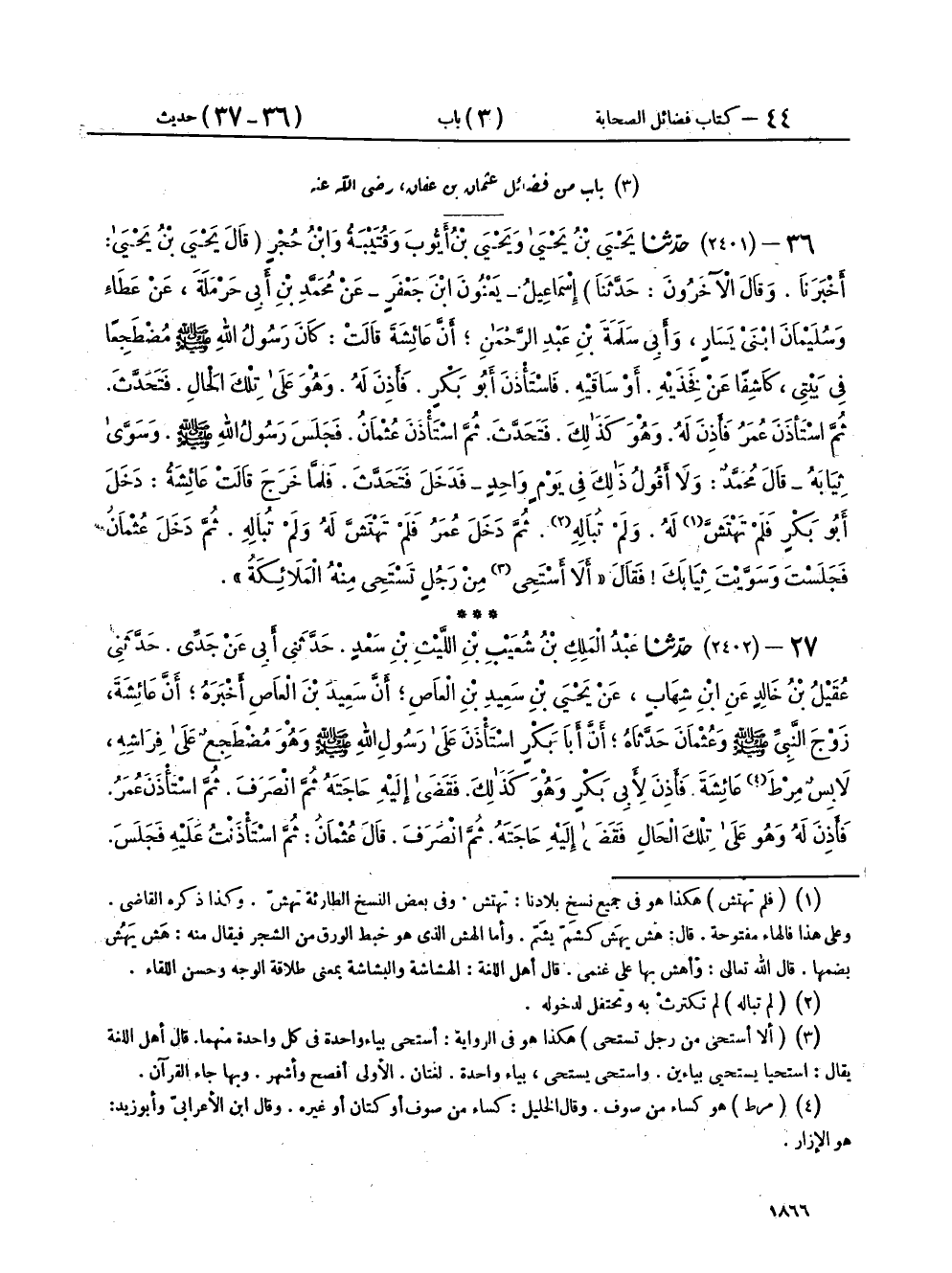 ٣٦ - (٢٤٠١) حَدَّثَنَا يَحْيَى بْنُ يَحْيَى، وَيَحْيَى بْنُ أَيُّوبَ، وَقُتَيْبَةُ، وَابْنُ حُجْرٍ - قَالَ: يَحْيَى بْنُ يَحْيَى، أَخْبَرَنَا، وقَالَ الْآخَرُونَ: حَدَّثَنَا - إِسْمَاعِيلُ يَعْنُونَ ابْنَ جَعْفَرٍ، عَنْ مُحَمَّدِ بْنِ أَبِي حَرْمَلَةَ، عَنْ عَطَاءٍ، وَسُلَيْمَانَ، ابْنَيْ يَسَارٍ، وَأَبِي سَلَمَةَ بْنِ عَبْدِ الرَّحْمَنِ، أَنَّ عَائِشَةَ، قَالَتْ: كَانَ رَسُولُ اللهِ صَلَّى اللهُ عَلَيْهِ وَسَلَّمَ مُضْطَجِعًا فِي بَيْتِي، كَاشِفًا عَنْ فَخِذَيْهِ، أَوْ سَاقَيْهِ، فَاسْتَأْذَنَ أَبُو بَكْرٍ فَأَذِنَ لَهُ، وَهُوَ عَلَى تِلْكَ الْحَالِ، فَتَحَدَّثَ، ثُمَّ اسْتَأْذَنَ عُمَرُ، فَأَذِنَ لَهُ، وَهُوَ كَذَلِكَ، فَتَحَدَّثَ، ثُمَّ اسْتَأْذَنَ عُثْمَانُ، فَجَلَسَ رَسُولُ اللهِ صَلَّى اللهُ عَلَيْهِ وَسَلَّمَ، وَسَوَّى ثِيَابَهُ - قَالَ مُحَمَّدٌ: وَلَا أَقُولُ ذَلِكَ فِي يَوْمٍ وَاحِدٍ - فَدَخَلَ فَتَحَدَّثَ، فَلَمَّا خَرَجَ قَالَتْ عَائِشَةُ: دَخَلَ أَبُو بَكْرٍ فَلَمْ تَهْتَشَّ لَهُ وَلَمْ تُبَالِهِ، ثُمَّ دَخَلَ عُمَرُ فَلَمْ تَهْتَشَّ لَهُ وَلَمْ تُبَالِهِ، ثُمَّ دَخَلَ عُثْمَانُ فَجَلَسْتَ وَسَوَّيْتَ ثِيَابَكَ فَقَالَ: «أَلَا أَسْتَحِي مِنْ رَجُلٍ تَسْتَحِي مِنْهُ الْمَلَائِكَةُ»