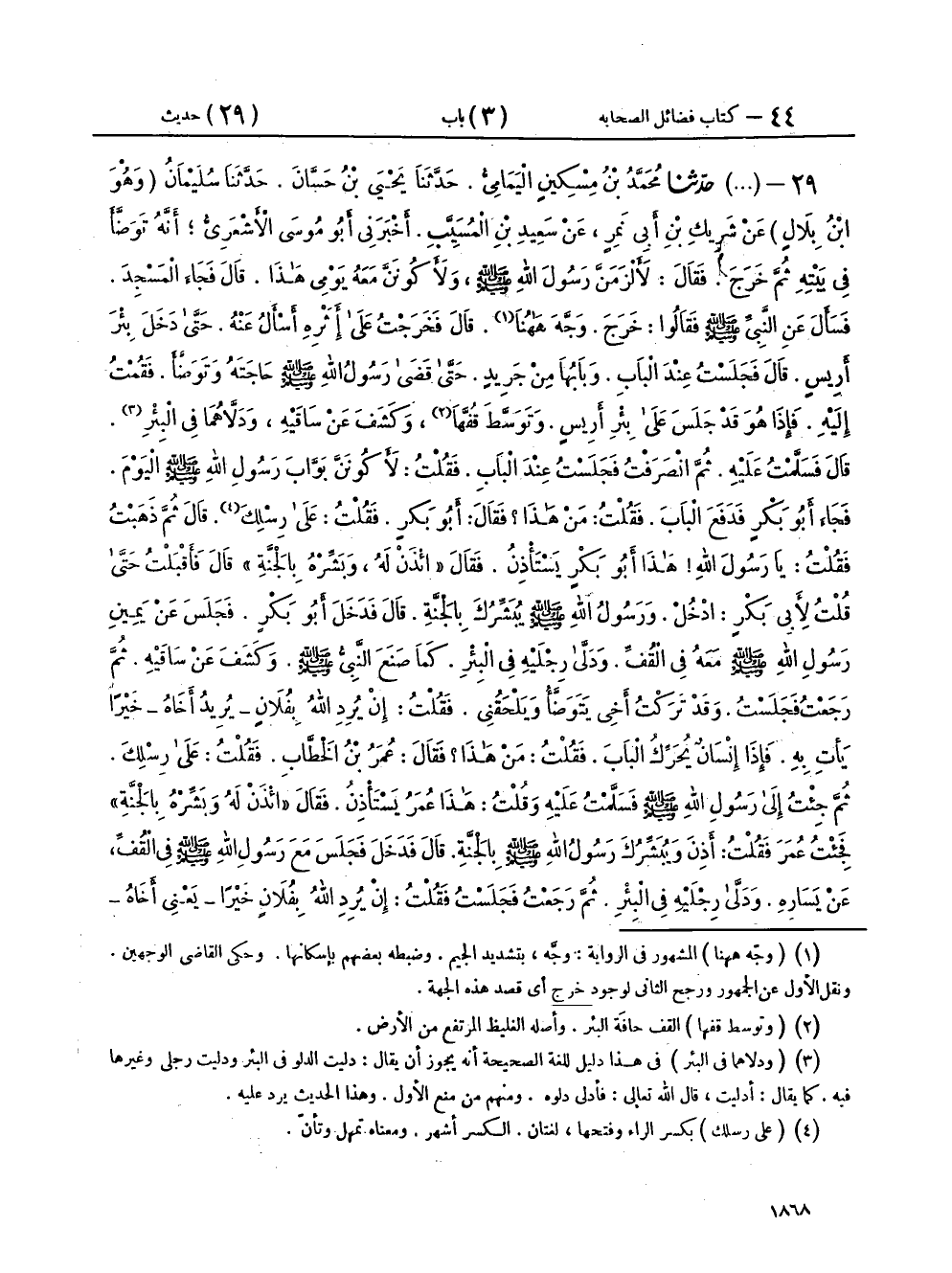 ٢٩ - (٢٤٠٣) حَدَّثَنَا مُحَمَّدُ بْنُ مِسْكِينٍ الْيَمَامِيُّ، حَدَّثَنَا يَحْيَى بْنُ حَسَّانَ، حَدَّثَنَا سُلَيْمَانُ وَهُوَ ابْنُ بِلَالٍ، عَنْ شَرِيكِ بْنِ أَبِي نَمِرٍ، عَنْ سَعِيدِ بْنِ الْمُسَيِّبِ، أَخْبَرَنِي أَبُو مُوسَى الْأَشْعَرِيُّ، أَنَّهُ تَوَضَّأَ فِي بَيْتِهِ ثُمَّ خَرَجَ، فَقَالَ: لَأَلْزَمَنَّ رَسُولَ اللهِ صَلَّى اللهُ عَلَيْهِ وَسَلَّمَ، وَلَأَكُونَنَّ مَعَهُ يَوْمِي هَذَا، قَالَ: فَجَاءَ الْمَسْجِدَ، فَسَأَلَ عَنِ النَّبِيِّ صَلَّى اللهُ عَلَيْهِ وَسَلَّمَ فَقَالُوا: خَرَجَ، وَجَّهَ هَاهُنَا، قَالَ فَخَرَجْتُ عَلَى أَثَرِهِ أَسْأَلُ عَنْهُ، حَتَّى دَخَلَ بِئْرَ أَرِيسٍ، قَالَ: فَجَلَسْتُ عِنْدَ الْبَابِ، وَبَابُهَا مِنْ جَرِيدٍ، حَتَّى قَضَى رَسُولُ اللهِ صَلَّى اللهُ عَلَيْهِ وَسَلَّمَ حَاجَتَهُ وَتَوَضَّأَ، فَقُمْتُ إِلَيْهِ، فَإِذَا هُوَ قَدْ جَلَسَ عَلَى بِئْرِ أَرِيسٍ وَتَوَسَّطَ قُفَّهَا، وَكَشَفَ عَنْ سَاقَيْهِ، وَدَلَّاهُمَا فِي الْبِئْرِ، قَالَ: فَسَلَّمْتُ عَلَيْهِ، ثُمَّ انْصَرَفْتُ فَجَلَسْتُ عِنْدَ الْبَابِ، فَقُلْتُ: لَأَكُونَنَّ بَوَّابَ رَسُولِ اللهِ صَلَّى اللهُ عَلَيْهِ وَسَلَّمَ الْيَوْمَ، فَجَاءَ أَبُو بَكْرٍ فَدَفَعَ الْبَابَ، فَقُلْتُ: مَنْ هَذَا؟ فَقَالَ أَبُو بَكْرٍ: فَقُلْتُ: عَلَى رِسْلِكَ، قَالَ: ثُمَّ ذَهَبْتُ فَقُلْتُ: يَا رَسُولَ اللهِ هَذَا أَبُو بَكْرٍ يَسْتَأْذِنُ، فَقَالَ: «ائْذَنْ لَهُ، وَبَشِّرْهُ بِالْجَنَّةِ» قَالَ فَأَقْبَلْتُ حَتَّى قُلْتُ: لِأَبِي بَكْرٍ ادْخُلْ، وَرَسُولُ اللهِ صَلَّى اللهُ عَلَيْهِ وَسَلَّمَ يُبَشِّرُكَ بِالْجَنَّةِ، قَالَ: فَدَخَلَ أَبُو بَكْرٍ، فَجَلَسَ عَنْ يَمِينِ رَسُولِ اللهِ صَلَّى اللهُ عَلَيْهِ وَسَلَّمَ، مَعَهُ فِي الْقُفِّ، وَدَلَّى رِجْلَيْهِ فِي الْبِئْرِ، كَمَا صَنَعَ النَّبِيُّ صَلَّى اللهُ عَلَيْهِ وَسَلَّمَ، وَكَشَفَ عَنْ سَاقَيْهِ، ثُمَّ رَجَعْتُ فَجَلَسْتُ، وَقَدْ تَرَكْتُ أَخِي يَتَوَضَّأُ وَيَلْحَقُنِي، فَقُلْتُ: إِنْ يُرِدِ اللهُ بِفُلَانٍ - يُرِيدُ أَخَاهُ - خَيْرًا يَأْتِ بِهِ، فَإِذَا إِنْسَانٌ يُحَرِّكُ الْبَابَ، فَقُلْتُ: مَنْ هَذَا؟ فَقَالَ: عُمَرُ بْنُ الْخَطَّابِ فَقُلْتُ: عَلَى رِسْلِكَ، ثُمَّ جِئْتُ إِلَى رَسُولِ اللهِ صَلَّى اللهُ عَلَيْهِ وَسَلَّمَ فَسَلَّمْتُ عَلَيْهِ وَقُلْتُ: هَذَا عُمَرُ يَسْتَأْذِنُ، فَقَالَ: «ائْذَنْ لَهُ وَبَشِّرْهُ بِالْجَنَّةِ» فَجِئْتُ عُمَرَ فَقُلْتُ: أَذِنَ وَيُبَشِّرُكَ رَسُولُ اللهِ صَلَّى اللهُ عَلَيْهِ وَسَلَّمَ، بِالْجَنَّةِ، قَالَ فَدَخَلَ فَجَلَسَ مَعَ رَسُولِ اللهِ صَلَّى اللهُ عَلَيْهِ وَسَلَّمَ فِي الْقُفِّ، عَنْ يَسَارِهِ، وَدَلَّى رِجْلَيْهِ فِي الْبِئْرِ، ثُمَّ رَجَعْتُ فَجَلَسْتُ فَقُلْتُ: إِنْ يُرِدِ اللهُ بِفُلَانٍ خَيْرًا - يَعْنِي أَخَاهُ - يَأْتِ بِهِ، فَجَاءَ إِنْسَانٌ فَحَرَّكَ الْبَابَ، فَقُلْتُ: مَنْ هَذَا؟ فَقَالَ: عُثْمَانُ بْنُ عَفَّانَ فَقُلْتُ: عَلَى رِسْلِكَ، قَالَ وَجِئْتُ النَّبِيَّ صَلَّى اللهُ عَلَيْهِ وَسَلَّمَ فَأَخْبَرْتُهُ، فَقَالَ: «ائْذَنْ لَهُ وَبَشِّرْهُ بِالْجَنَّةِ، مَعَ بَلْوَى تُصِيبُهُ» قَالَ فَجِئْتُ فَقُلْتُ: ادْخُلْ، وَيُبَشِّرُكَ رَسُولُ اللهِ صَلَّى اللهُ عَلَيْهِ وَسَلَّمَ بِالْجَنَّةِ مَعَ بَلْوَى تُصِيبُكَ، قَالَ فَدَخَلَ فَوَجَدَ الْقُفَّ قَدْ مُلِئَ، فَجَلَسَ وِجَاهَهُمْ مِنَ الشِّقِّ الْآخَرِ. قَالَ شَرِيكٌ: فَقَالَ سَعِيدُ بْنُ الْمُسَيِّبِ: فَأَوَّلْتُهَا قُبُورَهُمْ
