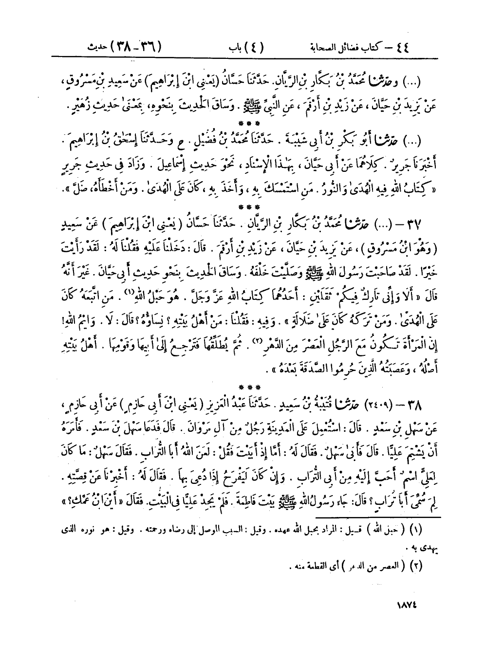 ٣٧ - (٢٤٠٨) حَدَّثَنَا مُحَمَّدُ بْنُ بَكَّارِ بْنِ الرَّيَّانِ، حَدَّثَنَا حَسَّانُ يَعْنِي ابْنَ إِبْرَاهِيمَ، عَنْ سَعِيدٍ وَهُوَ ابْنُ مَسْرُوقٍ، عَنْ يَزِيدَ بْنِ حَيَّانَ، عَنْ زَيْدِ بْنِ أَرْقَمَ، قَالَ: دَخَلْنَا عَلَيْهِ فَقُلْنَا لَهُ: لَقَدْ رَأَيْتَ خَيْرًا، لَقَدْ صَاحَبْتَ رَسُولَ اللهِ صَلَّى اللهُ عَلَيْهِ وَسَلَّمَ وَصَلَّيْتَ خَلْفَهُ، وَسَاقَ الْحَدِيثَ بِنَحْوِ حَدِيثِ أَبِي حَيَّانَ، غَيْرَ أَنَّهُ قَالَ: " أَلَا وَإِنِّي تَارِكٌ فِيكُمْ ثَقَلَيْنِ: أَحَدُهُمَا كِتَابُ اللهِ عَزَّ وَجَلَّ، هُوَ حَبْلُ اللهِ، مَنِ اتَّبَعَهُ كَانَ عَلَى الْهُدَى، وَمَنْ تَرَكَهُ كَانَ عَلَى ضَلَالَةٍ " وَفِيهِ فَقُلْنَا: مَنْ أَهْلُ بَيْتِهِ؟ نِسَاؤُهُ؟ قَالَ: لَا، وَايْمُ اللهِ إِنَّ الْمَرْأَةَ تَكُونُ مَعَ الرَّجُلِ الْعَصْرَ مِنَ الدَّهْرِ، ثُمَّ يُطَلِّقُهَا فَتَرْجِعُ إِلَى أَبِيهَا وَقَوْمِهَا أَهْلُ بَيْتِهِ أَصْلُهُ، وَعَصَبَتُهُ الَّذِينَ حُرِمُوا الصَّدَقَةَ بَعْدَهُ
