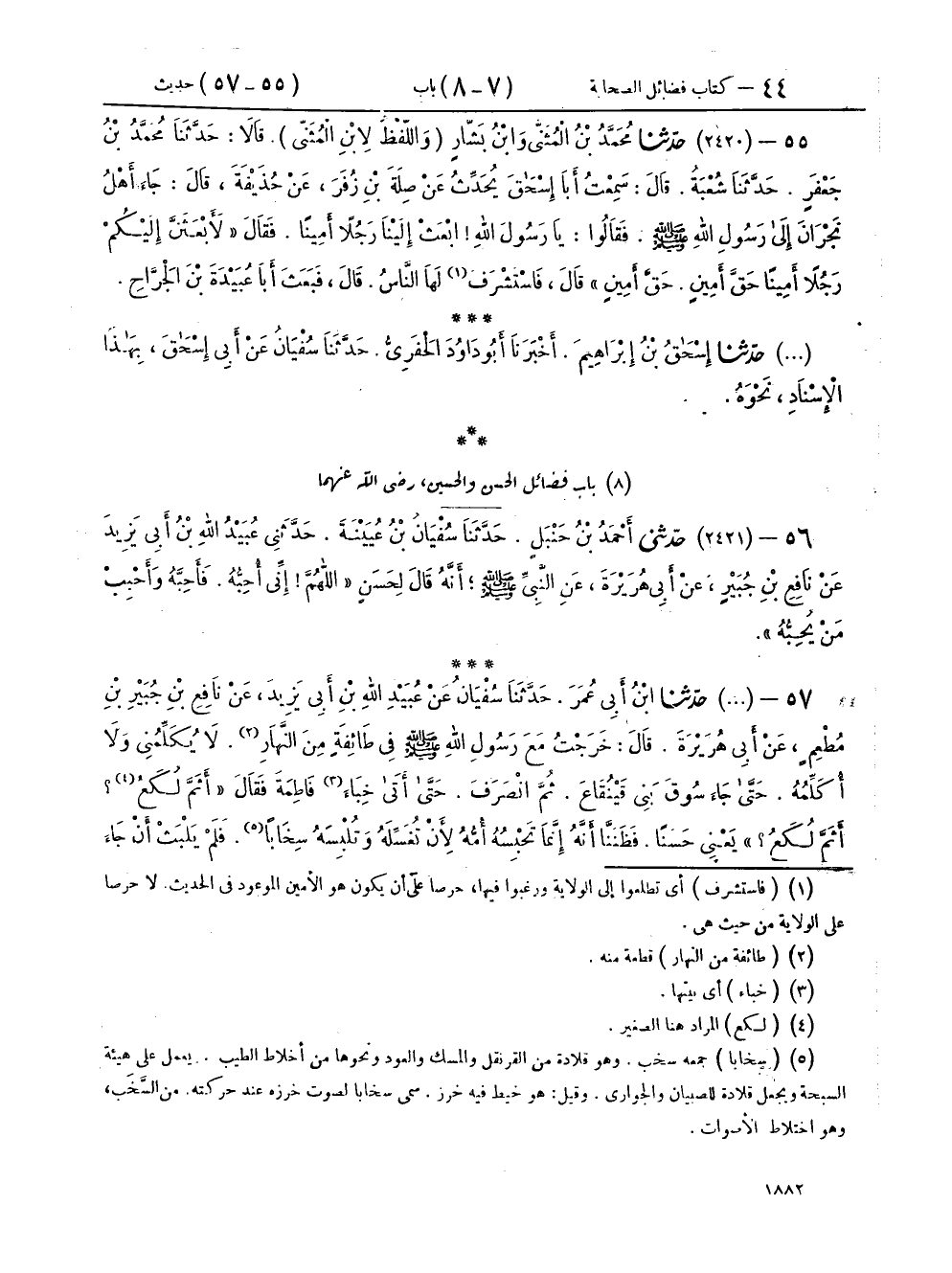 ٥٧ - (٢٤٢١) حَدَّثَنَا ابْنُ أَبِي عُمَرَ، حَدَّثَنَا سُفْيَانُ، عَنْ عُبَيْدِ اللهِ بْنِ أَبِي يَزِيدَ، عَنْ نَافِعِ بْنِ جُبَيْرِ بْنِ مُطْعِمٍ، عَنْ أَبِي هُرَيْرَةَ، قَالَ: خَرَجْتُ مَعَ رَسُولِ اللهِ صَلَّى اللهُ عَلَيْهِ وَسَلَّمَ فِي طَائِفَةٍ مِنَ النَّهَارِ، لَا يُكَلِّمُنِي وَلَا أُكَلِّمُهُ، حَتَّى جَاءَ سُوقَ بَنِي قَيْنُقَاعَ، ثُمَّ انْصَرَفَ، حَتَّى أَتَى خِبَاءَ فَاطِمَةَ فَقَالَ: «أَثَمَّ لُكَعُ؟ أَثَمَّ لُكَعُ؟» يَعْنِي حَسَنًا فَظَنَنَّا أَنَّهُ إِنَّمَا تَحْبِسُهُ أُمُّهُ لِأَنْ تُغَسِّلَهُ وَتُلْبِسَهُ سِخَابًا، فَلَمْ يَلْبَثْ أَنْ جَاءَ يَسْعَى، حَتَّى اعْتَنَقَ كُلُّ وَاحِدٍ مِنْهُمَا صَاحِبَهُ، فَقَالَ رَسُولُ اللهِ صَلَّى اللهُ عَلَيْهِ وَسَلَّمَ: «اللهُمَّ إِنِّي أُحِبُّهُ، فَأَحِبَّهُ وَأَحْبِبْ مَنْ يُحِبُّهُ»