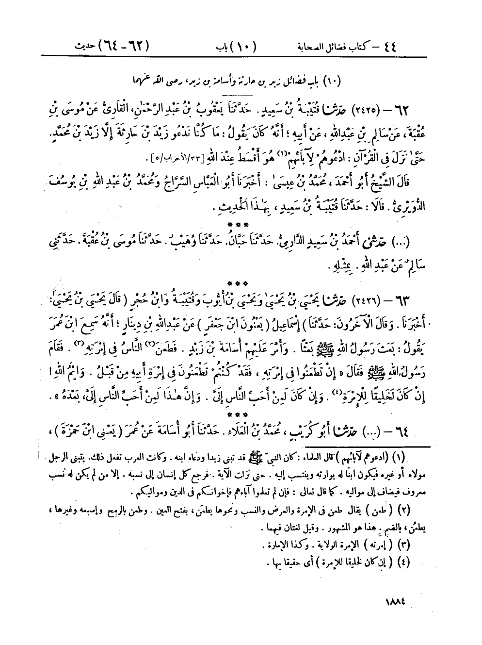٦٢ - (٢٤٢٥) حَدَّثَنَا قُتَيْبَةُ بْنُ سَعِيدٍ، حَدَّثَنَا يَعْقُوبُ بْنُ عَبْدِ الرَّحْمَنِ الْقَارِيُّ، عَنْ مُوسَى بْنِ عُقْبَةَ، عَنْ سَالِمِ بْنِ عَبْدِ اللهِ، عَنْ أَبِيهِ، أَنَّهُ كَانَ يَقُولُ: " مَا كُنَّا نَدْعُو زَيْدَ بْنَ حَارِثَةَ إِلَّا زَيْدَ بْنَ مُحَمَّدٍ حَتَّى نَزَلَ فِي الْقُرْآنِ {ادْعُوهُمْ لِآبَائِهِمْ هُوَ أَقْسَطُ عِنْدَ اللهِ} [الأحزاب: ٥] " قَالَ الشَّيْخُ أَبُو أَحْمَدَ مُحَمَّدُ بْنُ عِيسَى: أَخْبَرَنَا أَبُو الْعَبَّاسِ السَّرَّاجُ، وَمُحَمَّدُ بْنُ عَبْدِ اللهِ بْنِ يُوسُفَ الدُّوَيْرِيُّ، قَالَا: حَدَّثَنَا قُتَيْبَةُ بْنُ سَعِيدٍ، بِهَذَا الْحَدِيثِ.