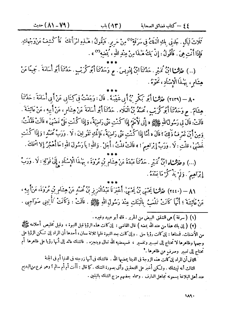 ٧٩ - حَدَّثَنَا ابْنُ نُمَيْرٍ، حَدَّثَنَا ابْنُ إِدْرِيسَ، ح وَحَدَّثَنَا أَبُو كُرَيْبٍ، حَدَّثَنَا أَبُو أُسَامَةَ، جَمِيعًا عَنْ هِشَامٍ، بِهَذَا الْإِسْنَادِ، نَحْوَهُ