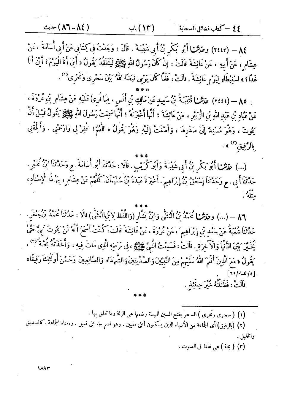 ٨٤ - (٢٤٤٣) وَحَدَّثَنَا أَبُو بَكْرِ بْنُ أَبِي شَيْبَةَ، قَالَ: وَجَدْتُ فِي كِتَابِي عَنْ أَبِي أُسَامَةَ، عَنْ هِشَامٍ، عَنْ أَبِيهِ، عَنْ عَائِشَةَ، قَالَتْ: إِنْ كَانَ رَسُولُ اللهِ صَلَّى اللهُ عَلَيْهِ وَسَلَّمَ، لَيَتَفَقَّدُ يَقُولُ: «أَيْنَ أَنَا الْيَوْمَ؟ أَيْنَ أَنَا غَدًا؟» اسْتِبْطَاءً لِيَوْمِ عَائِشَةَ، قَالَتْ: فَلَمَّا كَانَ يَوْمِي قَبَضَهُ اللهُ بَيْنَ سَحْرِي وَنَحْرِي