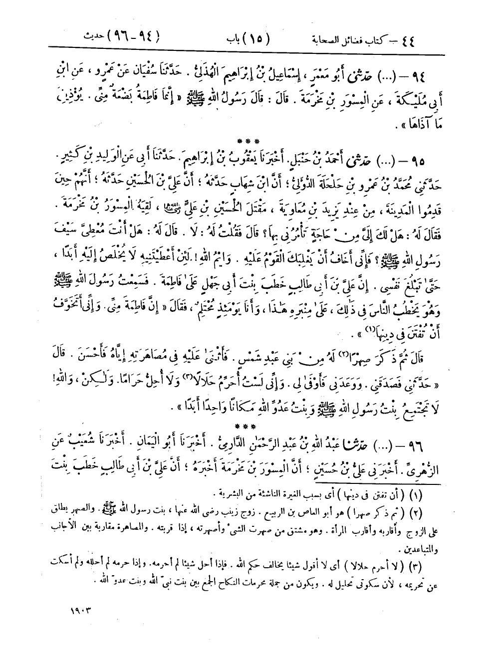 ٩٥ - (٢٤٤٩) حَدَّثَنِي أَحْمَدُ بْنُ حَنْبَلٍ، أَخْبَرَنَا يَعْقُوبُ بْنُ إِبْرَاهِيمَ، حَدَّثَنَا أَبِي، عَنِ الْوَلِيدِ بْنِ كَثِيرٍ، حَدَّثَنِي مُحَمَّدُ بْنُ عَمْرِو بْنِ حَلْحَلَةَ الدُّؤَلِيُّ، أَنَّ ابْنَ شِهَابٍ، حَدَّثَهُ أَنَّ عَلِيَّ بْنَ الْحُسَيْنِ، حَدَّثَهُ أَنَّهُمْ حِينَ قَدِمُوا الْمَدِينَةَ، مِنْ عِنْدِ يَزِيدَ بْنِ مُعَاوِيَةَ، مَقْتَلَ الْحُسَيْنِ بْنِ عَلِيٍّ رَضِيَ اللهُ عَنْهُمَا، لَقِيَهُ الْمِسْوَرُ بْنُ مَخْرَمَةَ، فَقَالَ لَهُ: هَلْ لَكَ إِلَيَّ مِنْ حَاجَةٍ تَأْمُرُنِي بِهَا؟ قَالَ فَقُلْتُ لَهُ: لَا، قَالَ لَهُ: هَلْ أَنْتَ مُعْطِيَّ سَيْفَ رَسُولِ اللهِ صَلَّى اللهُ عَلَيْهِ وَسَلَّمَ؟ فَإِنِّي أَخَافُ أَنْ يَغْلِبَكَ الْقَوْمُ عَلَيْهِ، وَايْمُ اللهِ لَئِنْ أَعْطَيْتَنِيهِ لَا يُخْلَصُ إِلَيْهِ أَبَدًا، حَتَّى تَبْلُغَ نَفْسِي، إِنَّ عَلِيَّ بْنَ أَبِي طَالِبٍ خَطَبَ بِنْتَ أَبِي جَهْلٍ عَلَى فَاطِمَةَ، فَسَمِعْتُ رَسُولَ اللهِ صَلَّى اللهُ عَلَيْهِ وَسَلَّمَ وَهُوَ يَخْطُبُ النَّاسَ فِي ذَلِكَ، عَلَى مِنْبَرِهِ هَذَا، وَأَنَا يَوْمَئِذٍ مُحْتَلِمٌ فَقَالَ: «إِنَّ فَاطِمَةَ مِنِّي، وَإِنِّي أَتَخَوَّفُ أَنْ تُفْتَنَ فِي دِينِهَا» قَالَ ثُمَّ ذَكَرَ صِهْرًا لَهُ مِنْ بَنِي عَبْدِ شَمْسٍ، فَأَثْنَى عَلَيْهِ فِي مُصَاهَرَتِهِ إِيَّاهُ فَأَحْسَنَ، قَالَ «حَدَّثَنِي فَصَدَقَنِي، وَوَعَدَنِي فَأَوْفَى لِي، وَإِنِّي لَسْتُ أُحَرِّمُ حَلَالًا وَلَا أُحِلُّ حَرَامًا، وَلَكِنْ وَاللهِ لَا تَجْتَمِعُ بِنْتُ رَسُولِ اللهِ صَلَّى اللهُ عَلَيْهِ وَسَلَّمَ وَبِنْتُ عَدُوِّ اللهِ مَكَانًا وَاحِدًا أَبَدًا»