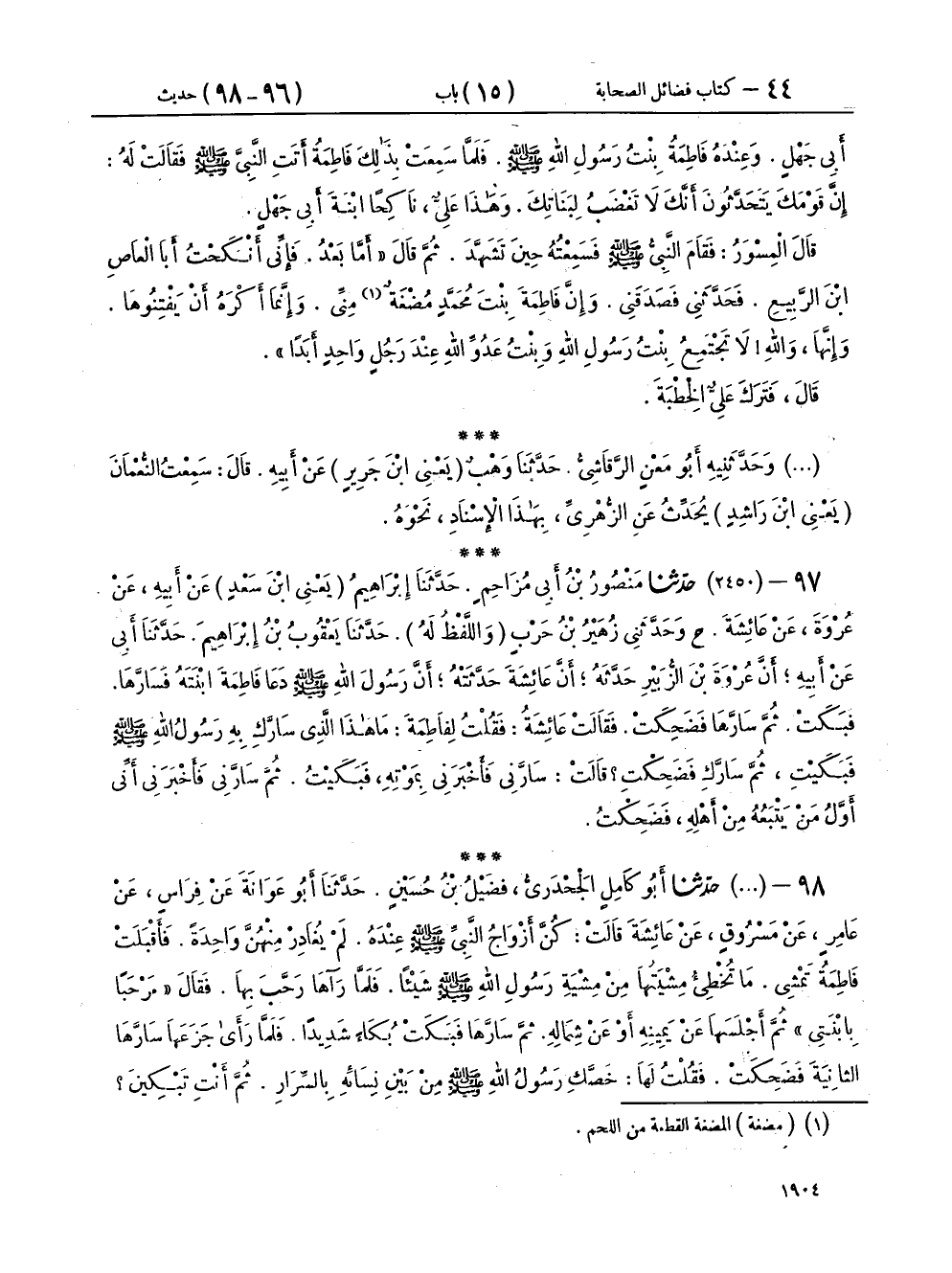 ٩٧ - (٢٤٥٠) حَدَّثَنَا مَنْصُورُ بْنُ أَبِي مُزَاحِمٍ، حَدَّثَنَا إِبْرَاهِيمُ يَعْنِي ابْنَ سَعْدٍ، عَنْ أَبِيهِ، عَنْ عُرْوَةَ، عَنْ عَائِشَةَ، ح وحَدَّثَنِي زُهَيْرُ بْنُ حَرْبٍ، - وَاللَّفْظُ لَهُ - حَدَّثَنَا يَعْقُوبُ بْنُ إِبْرَاهِيمَ، حَدَّثَنَا أَبِي، عَنْ أَبِيهِ، أَنَّ عُرْوَةَ بْنَ الزُّبَيْرِ، حَدَّثَهُ أَنَّ عَائِشَةَ حَدَّثَتْهُ أَنَّ رَسُولَ اللهِ صَلَّى اللهُ عَلَيْهِ وَسَلَّمَ «دَعَا فَاطِمَةَ ابْنَتَهُ فَسَارَّهَا فَبَكَتْ، ثُمَّ سَارَّهَا فَضَحِكَتْ» فَقَالَتْ عَائِشَةُ: فَقُلْتُ لِفَاطِمَةَ: مَا هَذَا الَّذِي سَارَّكِ بِهِ رَسُولُ اللهِ صَلَّى اللهُ عَلَيْهِ وَسَلَّمَ، فَبَكَيْتِ، ثُمَّ سَارَّكِ فَضَحِكْتِ؟ قَالَتْ: «سَارَّنِي فَأَخْبَرَنِي بِمَوْتِهِ، فَبَكَيْتُ، ثُمَّ سَارَّنِي، فَأَخْبَرَنِي أَنِّي أَوَّلُ مَنْ يَتْبَعُهُ مِنْ أَهْلِهِ فَضَحِكْتُ»