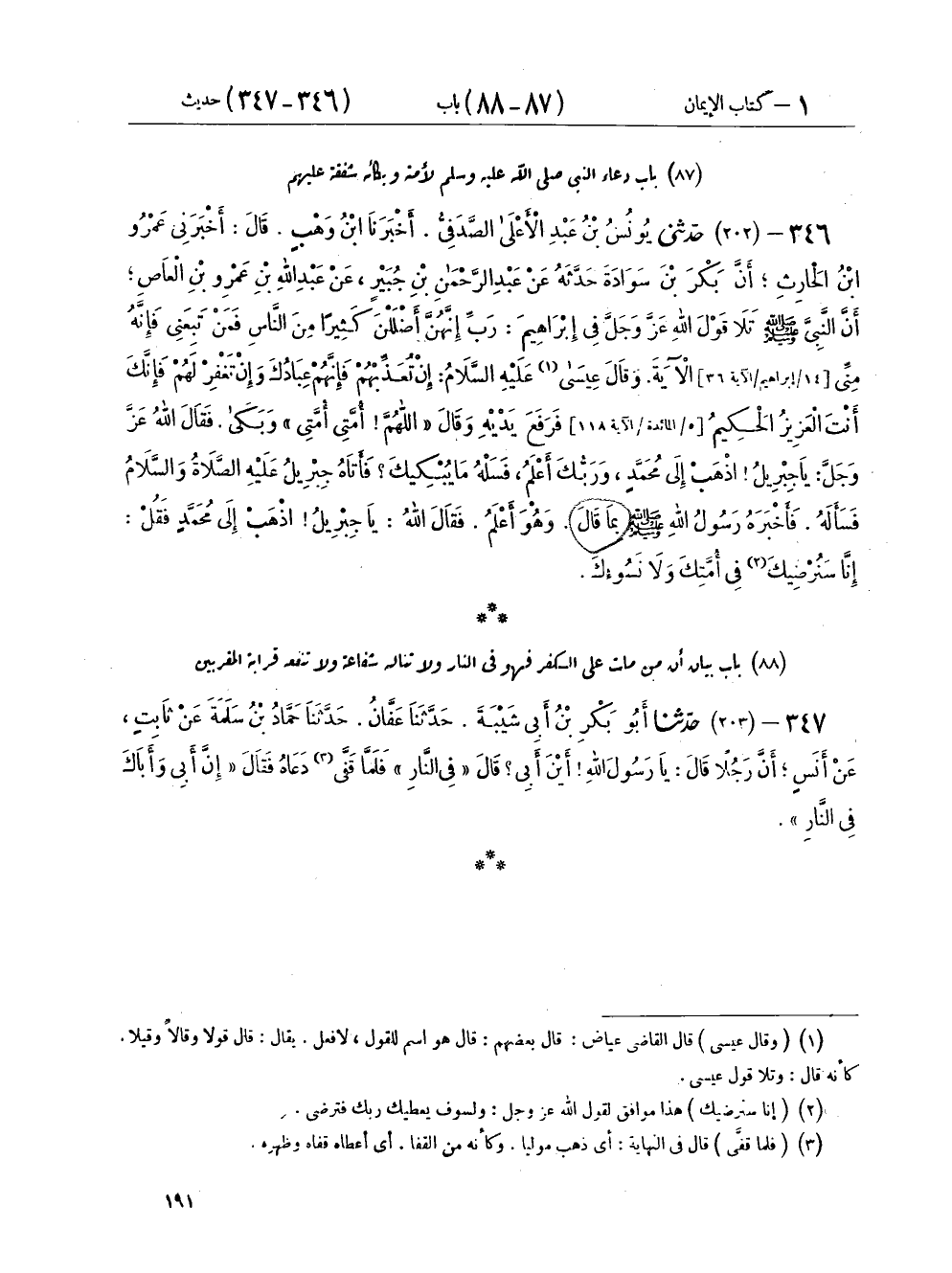 ٣٤٦ - (٢٠٢) حَدَّثَنِي يُونُسُ بْنُ عَبْدِ الْأَعْلَى الصَّدَفِيُّ، أَخْبَرَنَا ابْنُ وَهْبٍ، قَالَ: أَخْبَرَنِي عَمْرُو بْنُ الْحَارِثِ، أَنَّ بَكْرَ بْنَ سَوَادَةَ، حَدَّثَهُ عَنْ عَبْدِ الرَّحْمَنِ بْنِ جُبَيْرٍ، عَنْ عَبْدِ اللهِ بْنِ عَمْرِو بْنِ الْعَاصِ، أَنَّ النَّبِيَّ صَلَّى اللهُ عَلَيْهِ وَسَلَّمَ: تَلَا قَوْلَ اللهِ عَزَّ وَجَلَّ فِي إِبْرَاهِيمَ: {رَبِّ إِنَّهُنَّ أَضْلَلْنَ كَثِيرًا مِنَ النَّاسِ فَمَنْ تَبِعَنِي فَإِنَّهُ مِنِّي} [إبراهيم: ٣٦] الْآيَةَ، وَقَالَ عِيسَى عَلَيْهِ السَّلَامُ: {إِنْ تُعَذِّبْهُمْ فَإِنَّهُمْ عِبَادُكَ وَإِنْ تَغْفِرْ لَهُمْ فَإِنَّكَ أَنْتَ الْعَزِيزُ الْحَكِيمُ} [المائدة: ١١٨]، فَرَفَعَ يَدَيْهِ وَقَالَ: «اللهُمَّ أُمَّتِي أُمَّتِي»، وَبَكَى، فَقَالَ اللهُ عَزَّ وَجَلَّ: «يَا جِبْرِيلُ اذْهَبْ إِلَى مُحَمَّدٍ، وَرَبُّكَ أَعْلَمُ، فَسَلْهُ مَا يُبْكِيكَ؟» فَأَتَاهُ جِبْرِيلُ عَلَيْهِ الصَّلَاةُ وَالسَّلَامُ، فَسَأَلَهُ فَأَخْبَرَهُ رَسُولُ اللهِ صَلَّى اللهُ عَلَيْهِ وَسَلَّمَ بِمَا قَالَ، وَهُوَ أَعْلَمُ، فَقَالَ اللهُ: " يَا جِبْرِيلُ، اذْهَبْ إِلَى مُحَمَّدٍ، فَقُلْ: إِنَّا سَنُرْضِيكَ فِي أُمَّتِكَ، وَلَا نَسُوءُكَ "