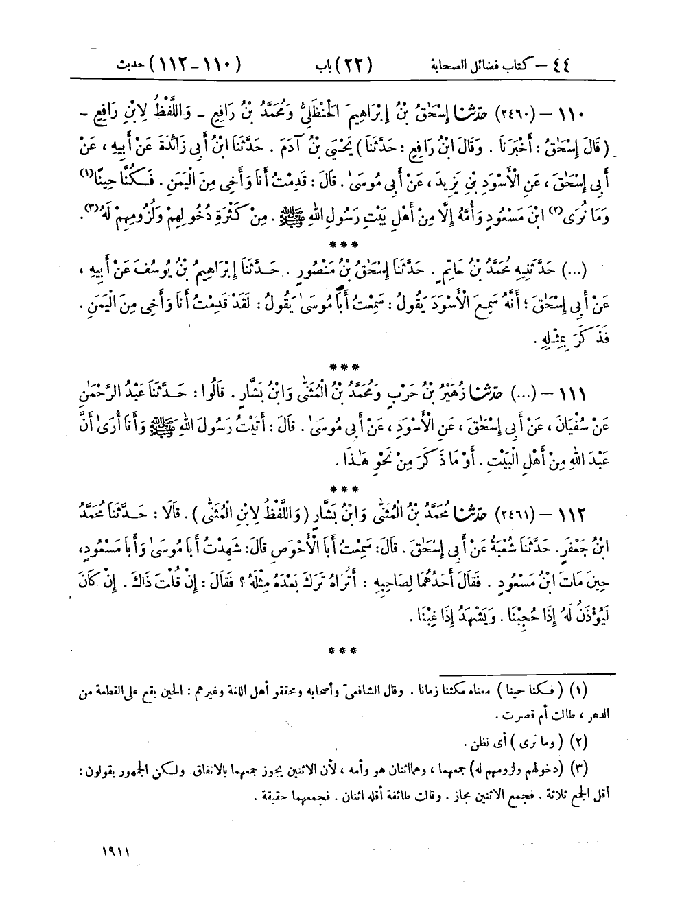 ١١٠ - وحَدَّثَنِيهِ مُحَمَّدُ بْنُ حَاتِمٍ، حَدَّثَنَا إِسْحَاقُ بْنُ مَنْصُورٍ، حَدَّثَنَا إِبْرَاهِيمُ بْنُ يُوسُفَ، عَنْ أَبِيهِ، عَنْ أَبِي إِسْحَاقَ، أَنَّهُ سَمِعَ الْأَسْوَدَ، يَقُولُ: سَمِعْتُ أَبَا مُوسَى، يَقُولُ: لَقَدْ قَدِمْتُ أَنَا وَأَخِي مِنَ الْيَمَنِ فَذَكَرَ بِمِثْلِهِ.