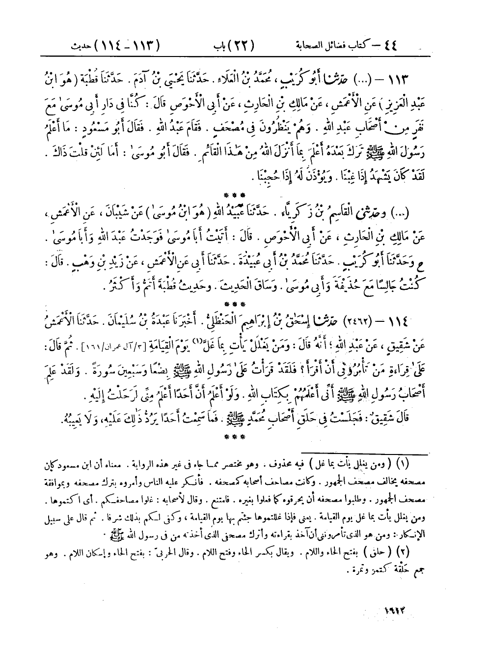 ١١٣ - وحَدَّثَنِي الْقَاسِمُ بْنُ زَكَرِيَّاءَ، حَدَّثَنَا عُبَيْدُ اللهِ هُوَ ابْنُ مُوسَى، عَنْ شَيْبَانَ، عَنِ الْأَعْمَشِ، عَنْ مَالِكِ بْنِ الْحَارِثِ، عَنْ أَبِي الْأَحْوَصِ، قَالَ: أَتَيْتُ أَبَا مُوسَى، فَوَجَدْتُ عَبْدَ اللهِ، وَأَبَا مُوسَى، ح وَحَدَّثَنَا أَبُو كُرَيْبٍ، حَدَّثَنَا مُحَمَّدُ بْنُ أَبِي عُبَيْدَةَ، حَدَّثَنَا أَبِي، عَنِ الْأَعْمَشِ، عَنْ زَيْدِ بْنِ وَهْبٍ، قَالَ: كُنْتُ جَالِسًا مَعَ حُذَيْفَةَ، وَأَبِي مُوسَى وَسَاقَ الْحَدِيثَ، وَحَدِيثُ قُطْبَةَ أَتَمُّ وَأَكْثَرُ