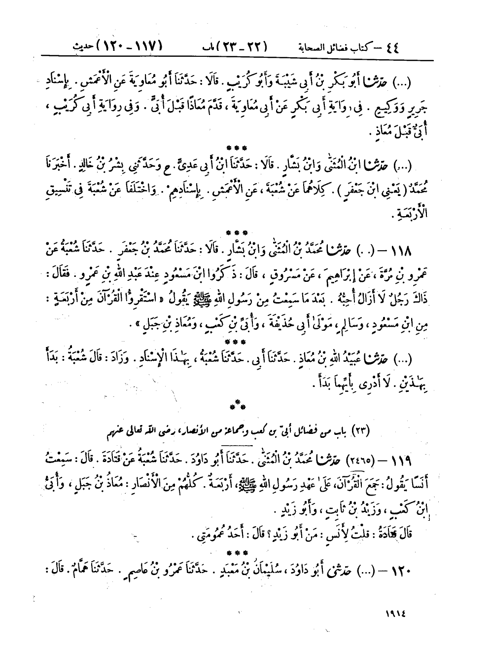١٢٠ - (٢٤٦٥) حَدَّثَنِي أَبُو دَاوُدَ سُلَيْمَانُ بْنُ مَعْبَدٍ، حَدَّثَنَا عَمْرُو بْنُ عَاصِمٍ، حَدَّثَنَا هَمَّامٌ، حَدَّثَنَا قَتَادَةُ، قَالَ: قُلْتُ لِأَنَسِ بْنِ مَالِكٍ: " مَنْ جَمَعَ الْقُرْآنَ عَلَى عَهْدِ رَسُولِ اللهِ صَلَّى اللهُ عَلَيْهِ وَسَلَّمَ؟ قَالَ: أَرْبَعَةٌ، كُلُّهُمْ مِنَ الْأَنْصَارِ: أُبَيُّ بْنُ كَعْبٍ، وَمُعَاذُ بْنُ جَبَلٍ، وَزَيْدُ بْنُ ثَابِتٍ، وَرَجُلٌ مِنَ الْأَنْصَارِ يُكْنَى أَبَا زَيْدٍ "