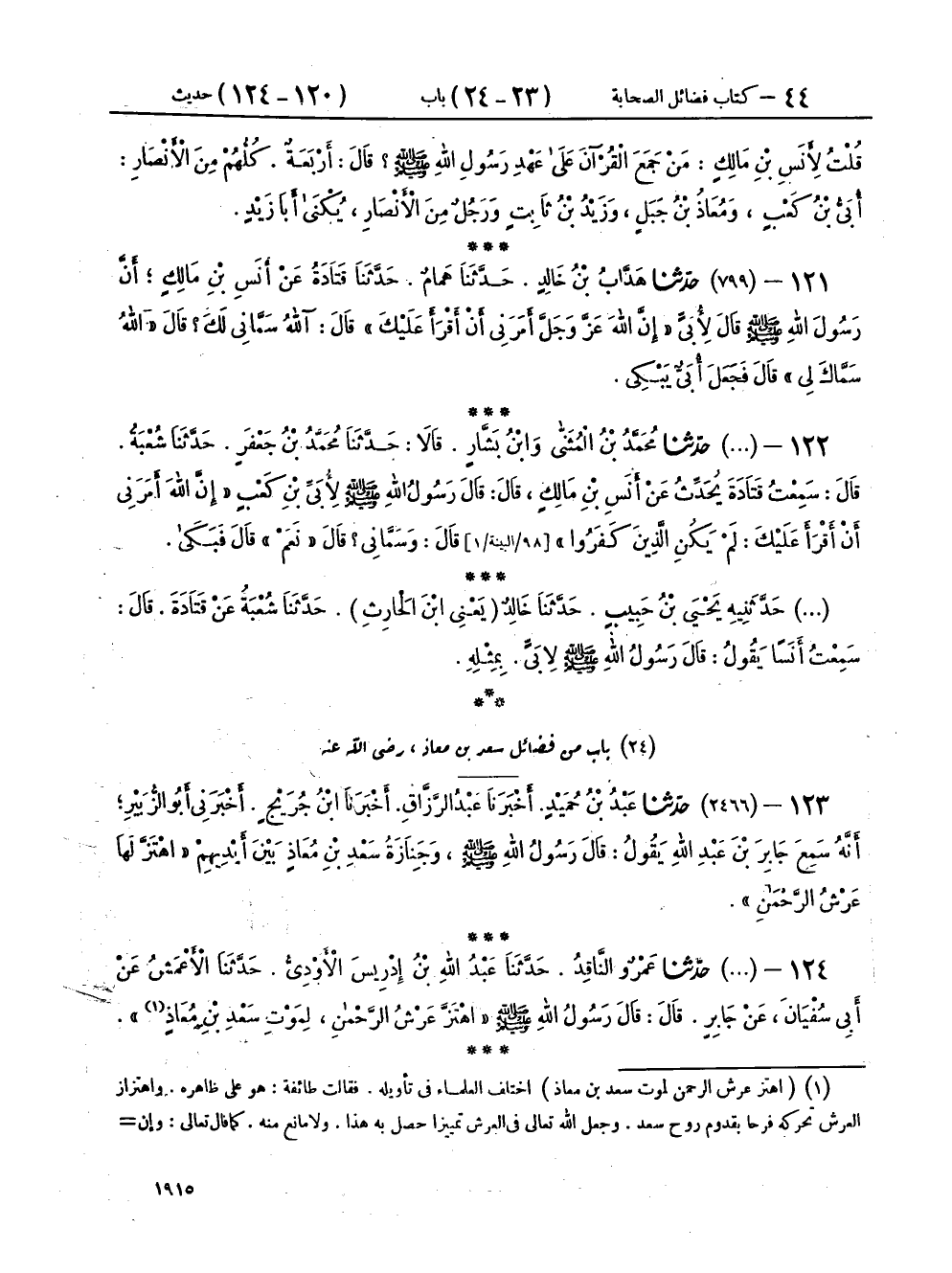 ١٢٤ - (٢٤٦٦) حَدَّثَنَا عَمْرٌو النَّاقِدُ، حَدَّثَنَا عَبْدُ اللهِ بْنُ إِدْرِيسَ الْأَوْدِيُّ، حَدَّثَنَا الْأَعْمَشُ، عَنْ أَبِي سُفْيَانَ، عَنْ جَابِرٍ، قَالَ: قَالَ رَسُولُ اللهِ صَلَّى اللهُ عَلَيْهِ وَسَلَّمَ: «اهْتَزَّ عَرْشُ الرَّحْمَنِ لِمَوْتِ سَعْدِ بْنِ مُعَاذٍ»
