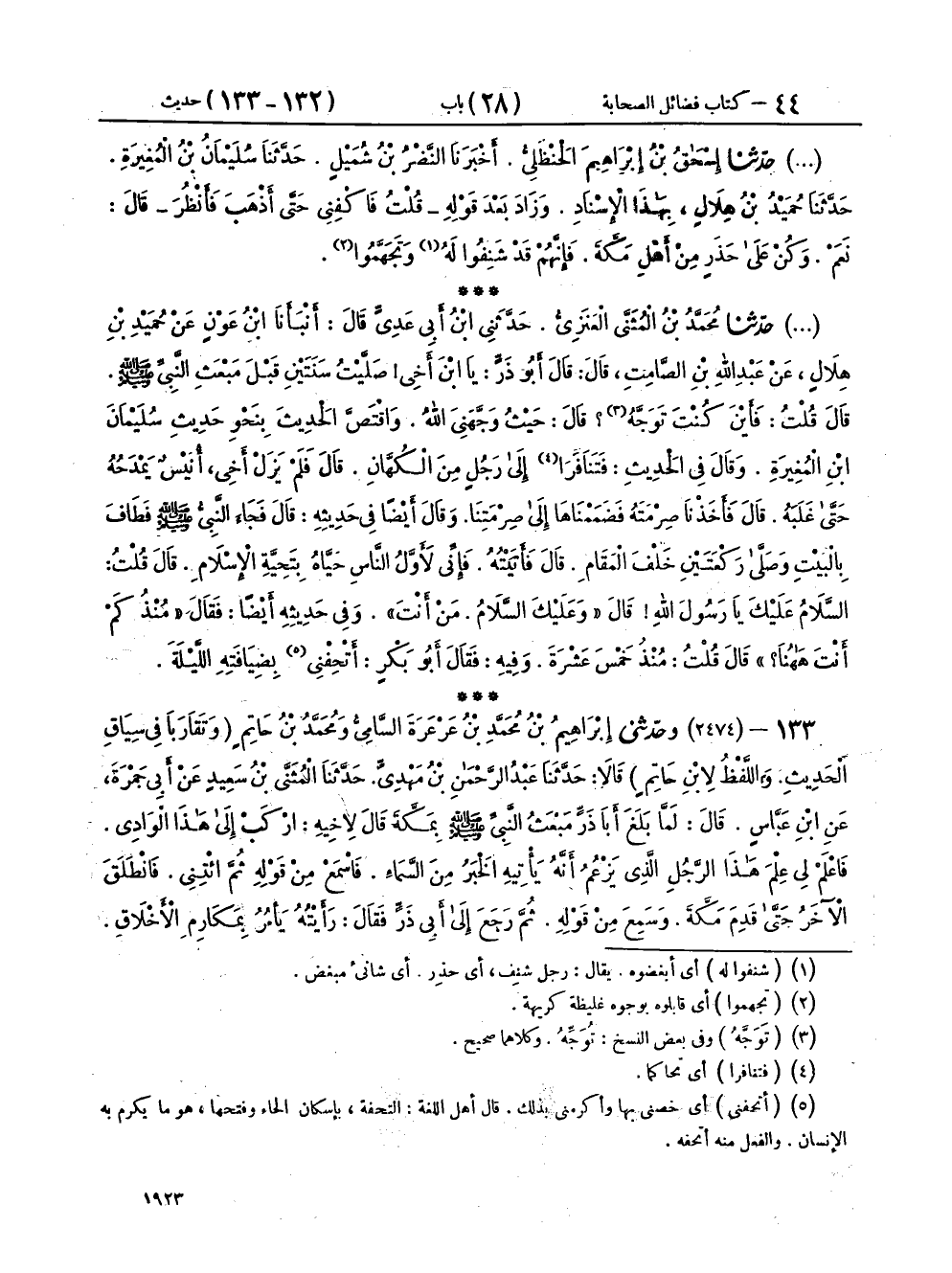 ١٣٢ - حَدَّثَنَا مُحَمَّدُ بْنُ الْمُثَنَّى الْعَنَزِيُّ، حَدَّثَنِي ابْنُ أَبِي عَدِيٍّ، قَالَ: أَنْبَأَنَا ابْنُ عَوْنٍ، عَنْ حُمَيْدِ بْنِ هِلَالٍ، عَنْ عَبْدِ اللهِ بْنِ الصَّامِتِ، قَالَ: قَالَ أَبُو ذَرٍّ: يَا ابْنَ أَخِي صَلَّيْتُ سَنَتَيْنِ قَبْلَ مَبْعَثِ النَّبِيِّ صَلَّى اللهُ عَلَيْهِ وَسَلَّمَ، قَالَ: قُلْتُ: فَأَيْنَ كُنْتَ تَوَجَّهُ؟ قَالَ: حَيْثُ وَجَّهَنِيَ اللهُ، وَاقْتَصَّ الْحَدِيثَ بِنَحْوِ حَدِيثِ سُلَيْمَانَ بْنِ الْمُغِيرَةِ، وَقَالَ فِي الْحَدِيثِ: فَتَنَافَرَا إِلَى رَجُلٍ مِنَ الْكُهَّانِ، قَالَ: فَلَمْ يَزَلْ أَخِي، أُنَيْسٌ يَمْدَحُهُ حَتَّى غَلَبَهُ، قَالَ: فَأَخَذْنَا صِرْمَتَهُ فَضَمَمْنَاهَا إِلَى صِرْمَتِنَا، وَقَالَ أَيْضًا فِي حَدِيثِهِ: قَالَ فَجَاءَ النَّبِيُّ صَلَّى اللهُ عَلَيْهِ وَسَلَّمَ فَطَافَ بِالْبَيْتِ وَصَلَّى رَكْعَتَيْنِ خَلْفَ الْمَقَامِ، قَالَ فَأَتَيْتُهُ، فَإِنِّي لَأَوَّلُ النَّاسِ حَيَّاهُ بِتَحِيَّةِ الْإِسْلَامِ، قَالَ قُلْتُ: السَّلَامُ عَلَيْكَ يَا رَسُولَ اللهِ قَالَ «وَعَلَيْكَ السَّلَامُ. مَنْ أَنْتَ» وَفِي حَدِيثِهِ أَيْضًا: فَقَالَ: «مُنْذُ كَمْ أَنْتَ هَاهُنَا؟» قَالَ قُلْتُ: مُنْذُ خَمْسَ عَشْرَةَ، وَفِيهِ: فَقَالَ أَبُو بَكْرٍ: أَتْحِفْنِي بِضِيَافَتِهِ اللَّيْلَةَ