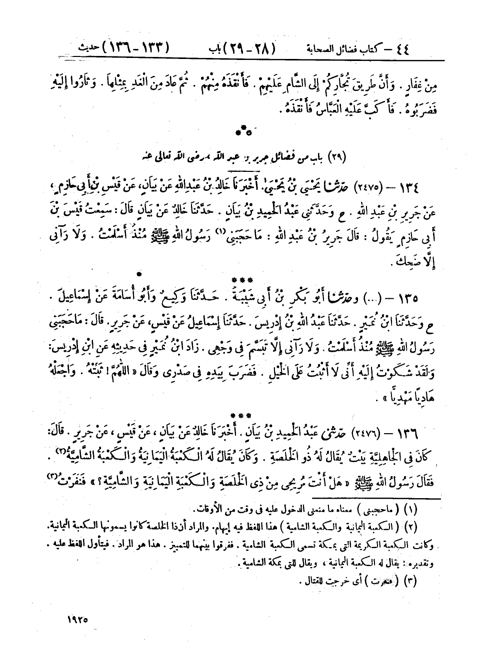١٣٥ - (٢٤٧٥) وَحَدَّثَنَا أَبُو بَكْرِ بْنُ أَبِي شَيْبَةَ، حَدَّثَنَا وَكِيعٌ، وَأَبُو أُسَامَةَ، عَنْ إِسْمَاعِيلَ، ح وَحَدَّثَنَا ابْنُ نُمَيْرٍ، حَدَّثَنَا عَبْدُ اللهِ بْنُ إِدْرِيسَ، حَدَّثَنَا إِسْمَاعِيلُ، عَنْ قَيْسٍ، عَنْ جَرِيرٍ، قَالَ: مَا حَجَبَنِي رَسُولُ اللهِ صَلَّى اللهُ عَلَيْهِ وَسَلَّمَ مُنْذُ أَسْلَمْتُ، وَلَا رَآنِي إِلَّا تَبَسَّمَ فِي وَجْهِي. زَادَ ابْنُ نُمَيْرٍ، فِي حَدِيثِهِ عَنِ ابْنِ إِدْرِيسَ: وَلَقَدْ شَكَوْتُ إِلَيْهِ أَنِّي لَا أَثْبُتُ عَلَى الْخَيْلِ، فَضَرَبَ بِيَدِهِ فِي صَدْرِي وَقَالَ: «اللهُمَّ ثَبِّتْهُ وَاجْعَلْهُ هَادِيًا مَهْدِيًّا»
